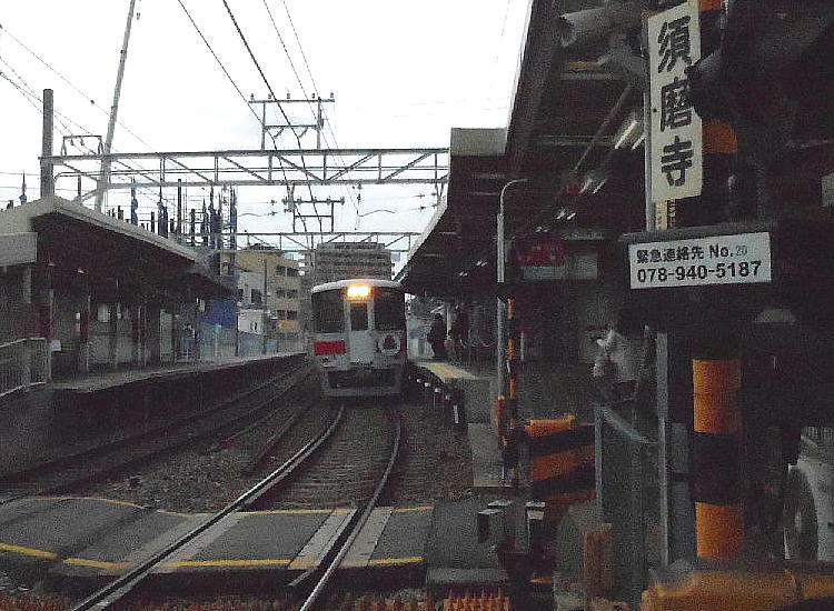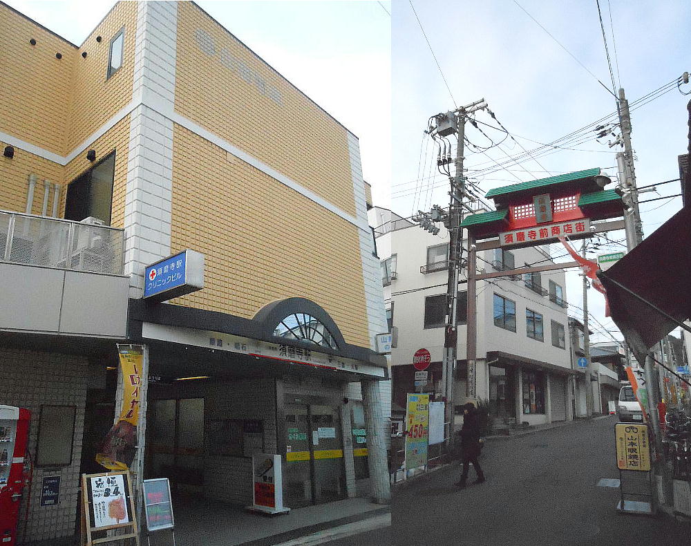 上が山陽電鉄須磨寺駅。右へ行けば須磨寺商店街を抜けて須磨寺へ。昔は門前町だったんだろうな。