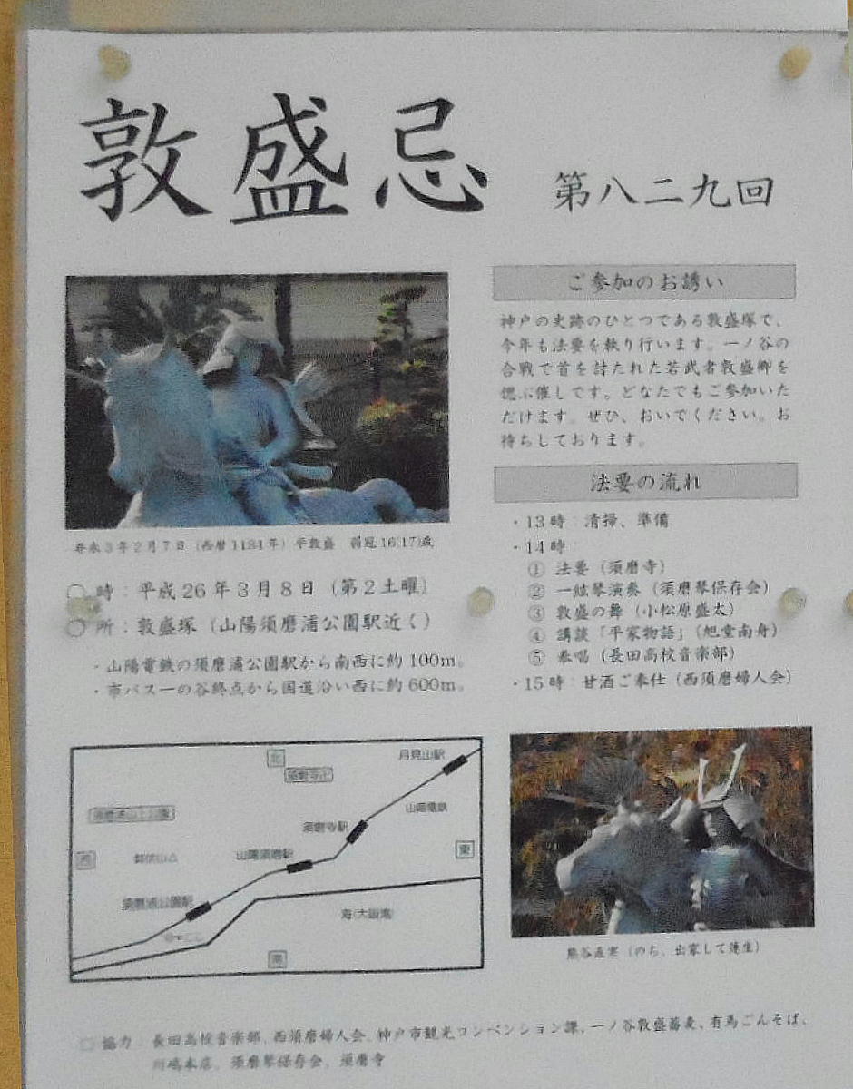 須磨は源平興亡の舞台となった地で、須磨寺にも平敦盛の首塚などの史跡があり、須磨寺境内には源平の庭が作られ、平敦盛と