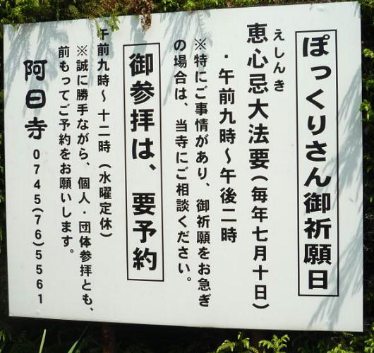 の本尊として祀られてきた。そのため阿日寺は、斑鳩の吉田寺と並ぶ「ぽっくり寺」として、全国から年配の参拝者が後を絶