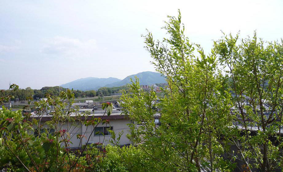 福應寺から西を望むと、正面に二上山雄岳(おだけ)がどっしりとした姿を見せる。田畑の向こうには民家。周囲は、きつ