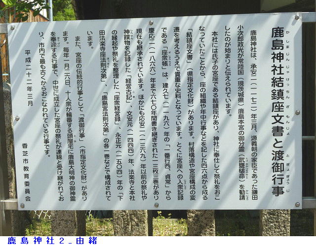 祭神は「武甕槌命」で、勧請伝承は、建仁元(1201)年の『鹿嶋大明神縁起写』や文安元(1444)年の『座衆経営