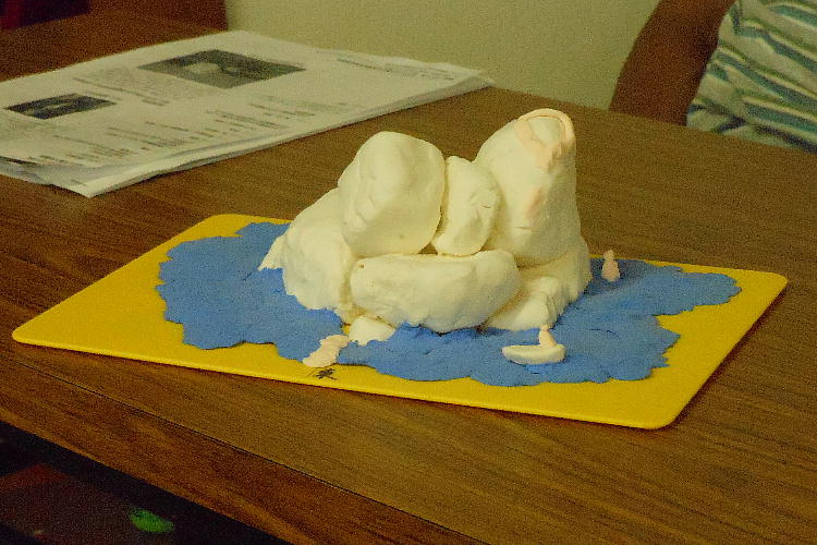 これが白石の鼻巨石群のひとつ「三つ岩」の模型。私は前の方の空いてる席に座り込んだが、目の前に之が置いてあった。