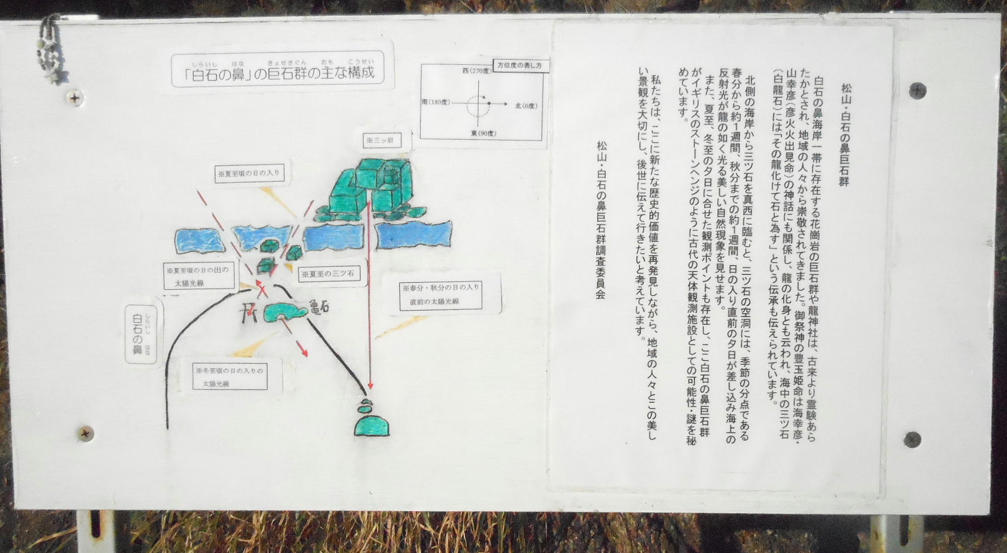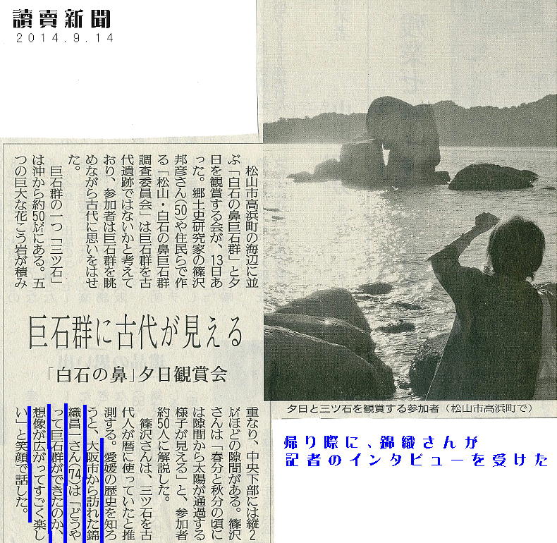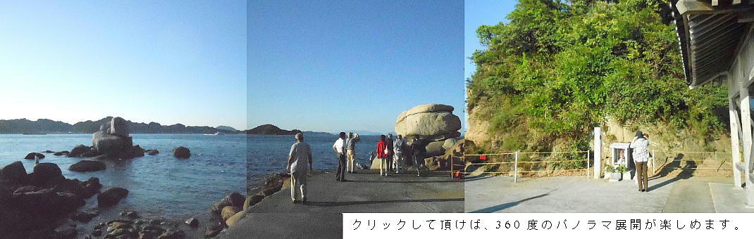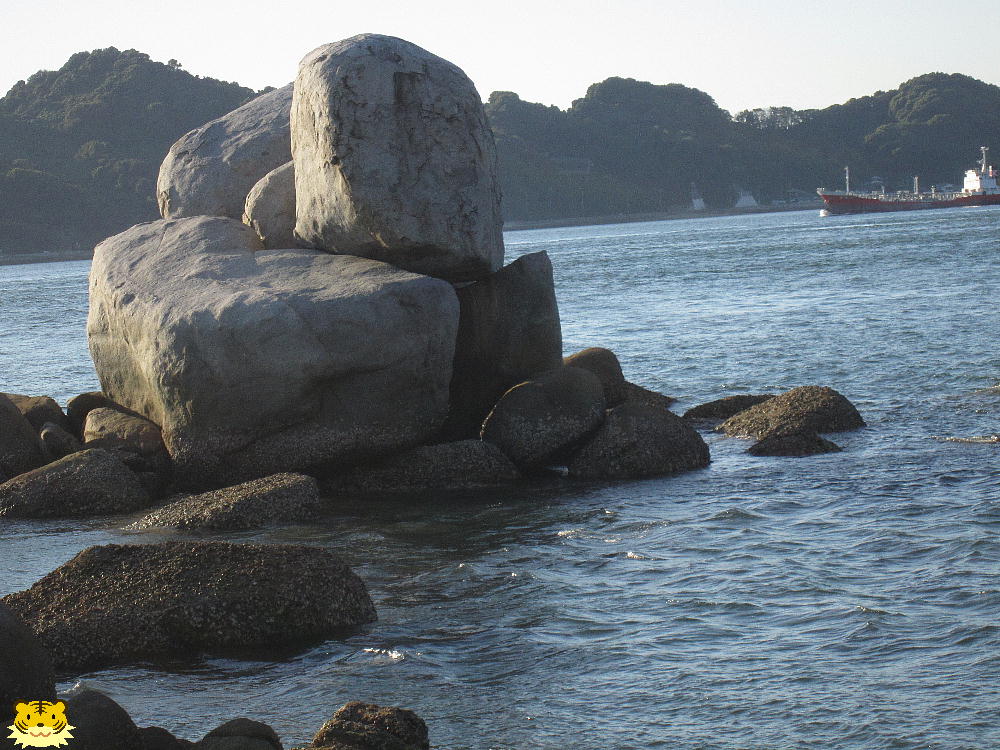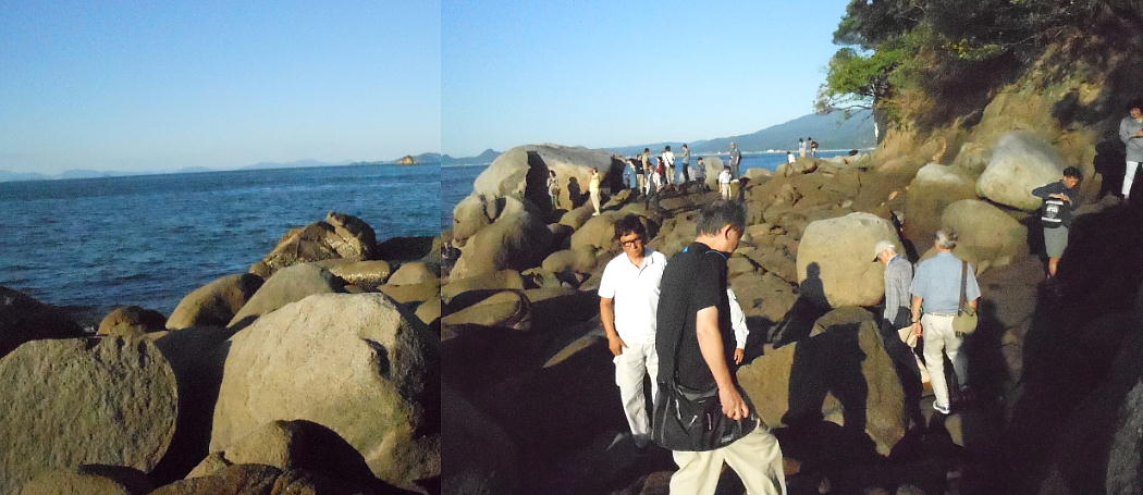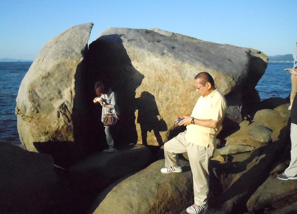 海の中に鎮座する「三っ岩」。ここに射す朝日や夕陽が計算されていると篠澤さん。勿論、古代人達がこの巨石を積んだ