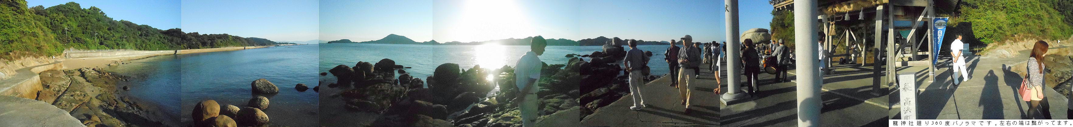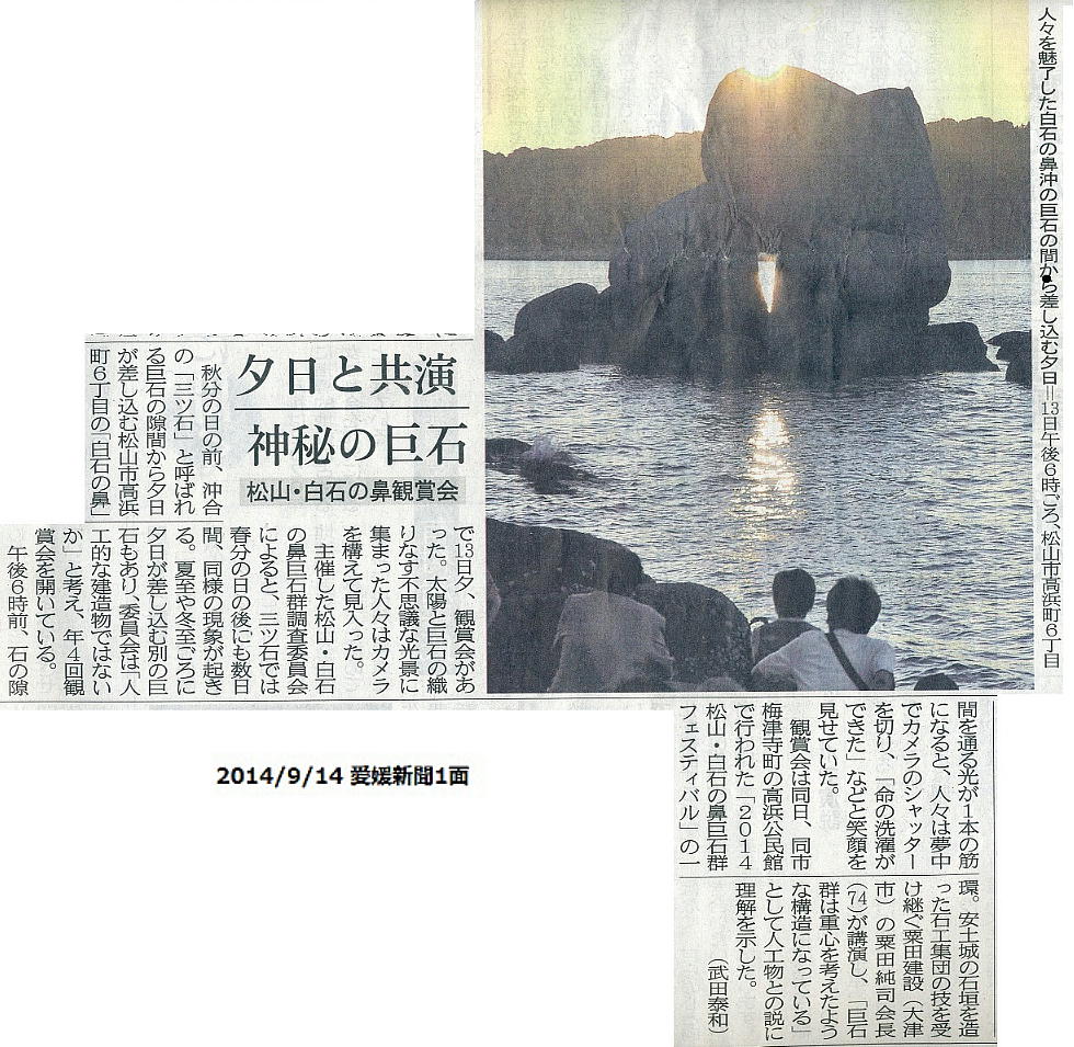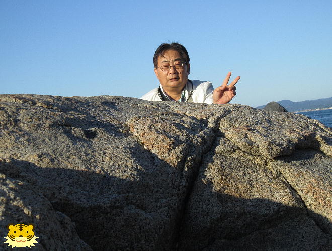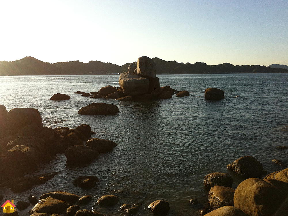 海の中に鎮座する「三っ岩」。ここに射す朝日や夕陽が計算されていると篠澤さん。勿論、古代人達がこの巨石を積んだ