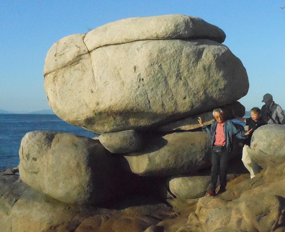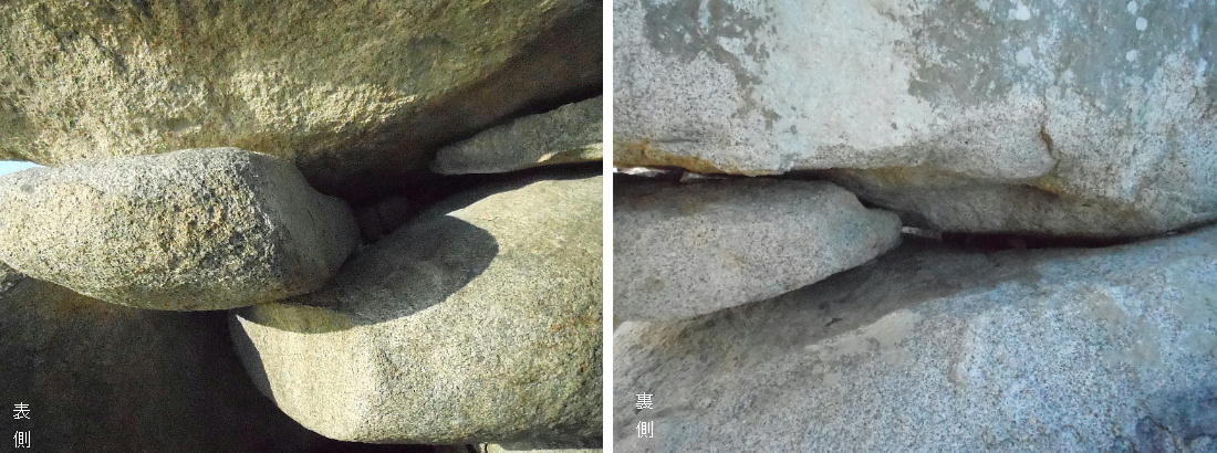 亀石(上)とその巨石の乗せ方(下)。篠澤さん、栗田さんによれば、これは人が乗せたモノだそうだ。自然にはこうは乗らないと。