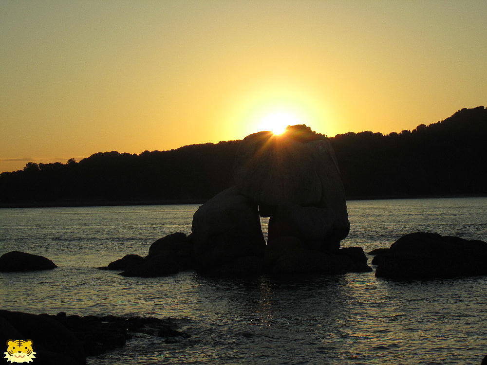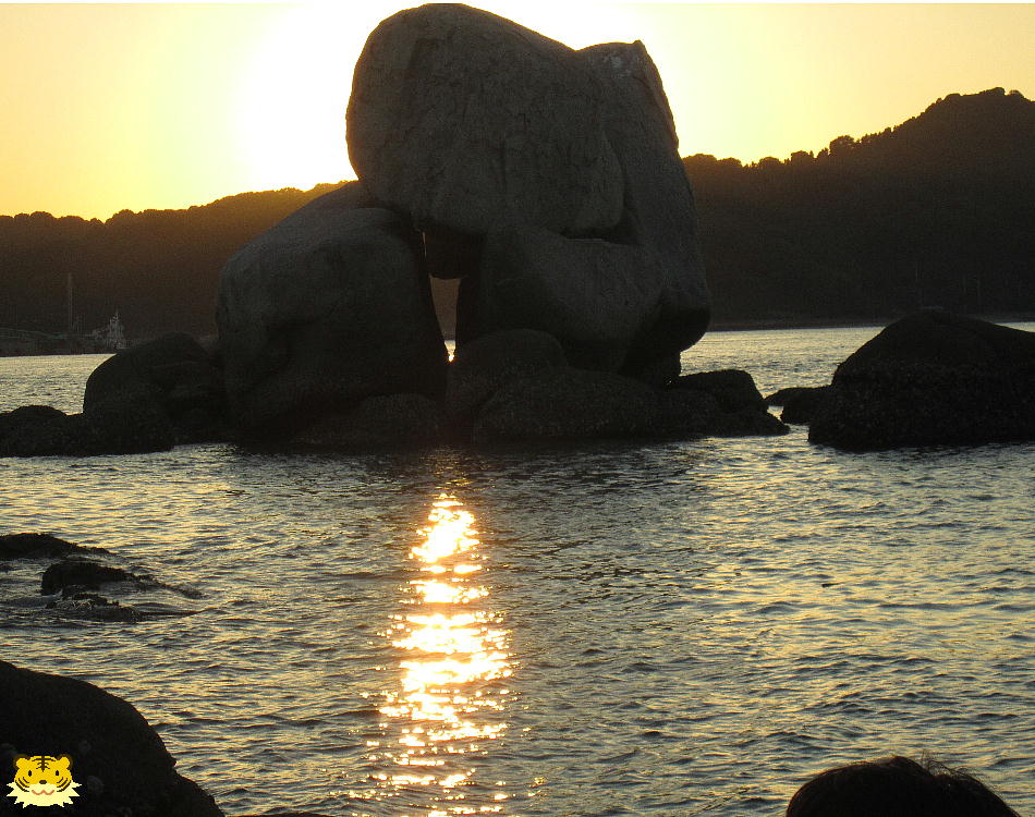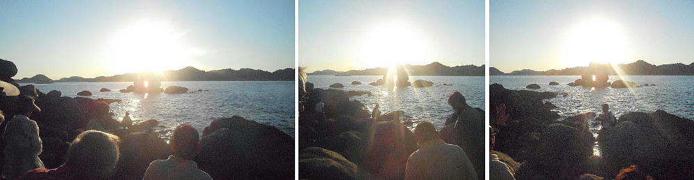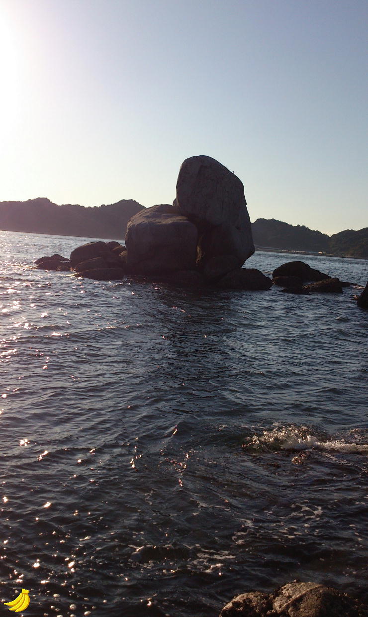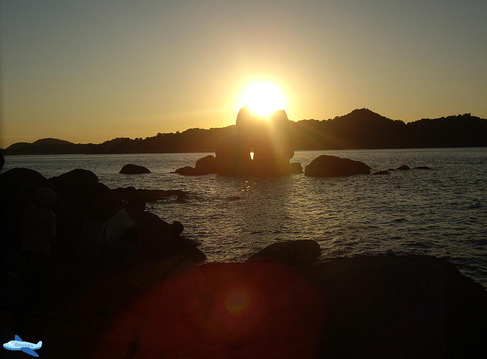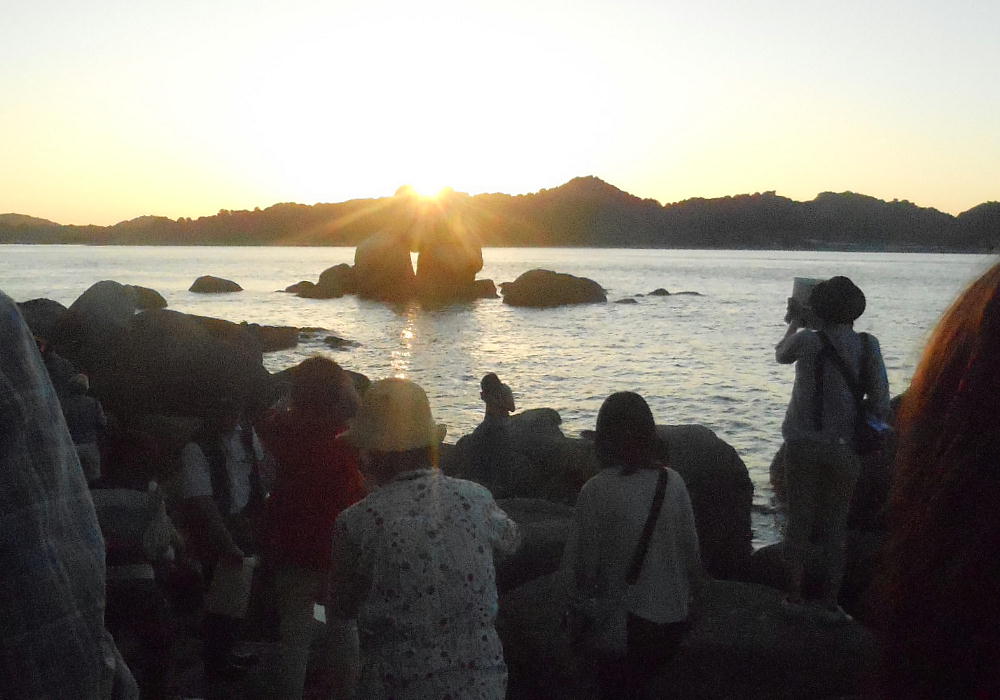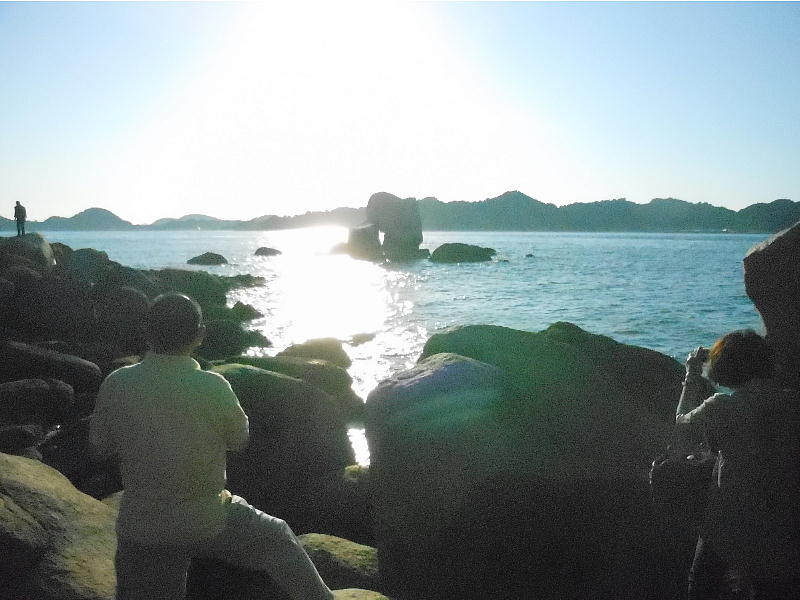 三っ岩の真ん中の隙間から注ぐ夕陽は一直線にこっち側へ届き、その線は岩の上を直線で進みその跡に紅い線が付いている。
