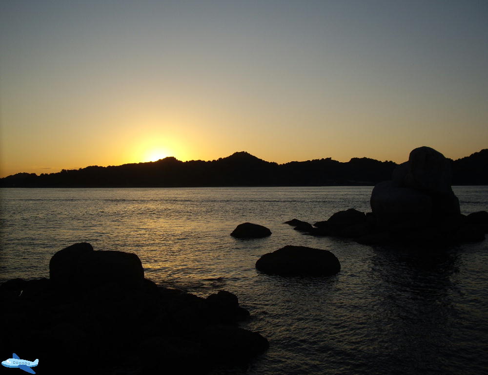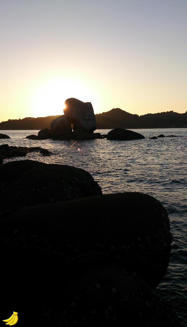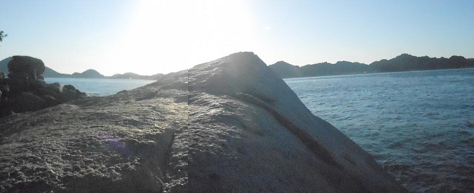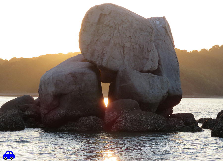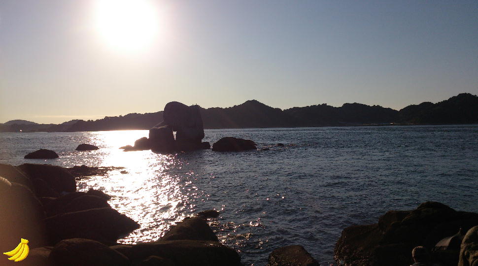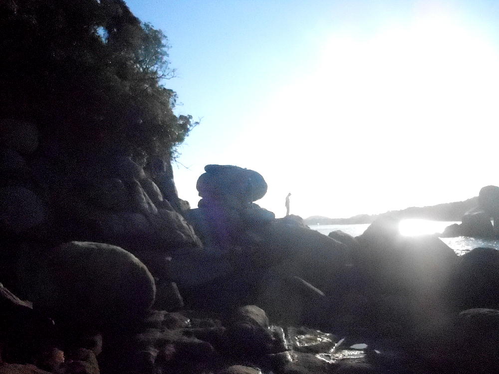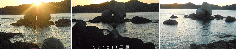 三っ岩の真ん中の隙間から注ぐ夕陽は一直線にこっち側へ届き、その線は岩の上を直線で進みその跡に紅い線が付いている。
