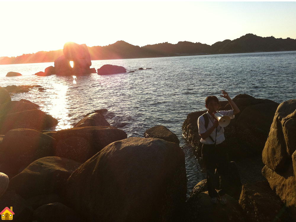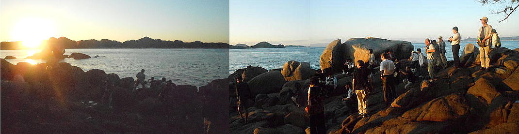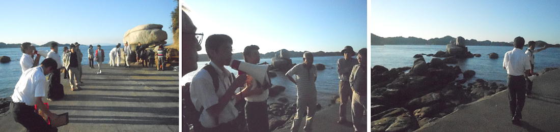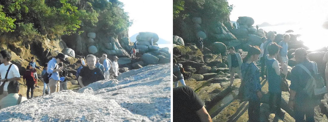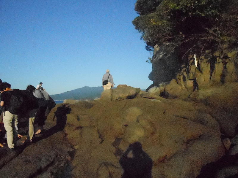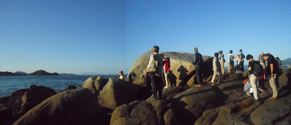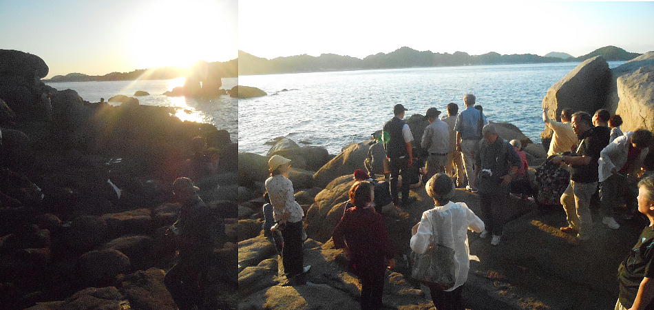「それでは夕陽鑑賞会を始めます」と篠澤さん、栗田さんが「夕陽と白石の鼻巨石群」についてその不思議さを解説。