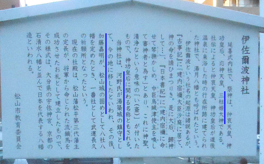 社伝によれば、仲哀天皇と神功皇后が道後温泉に来湯した際の行宮跡に創建されたという。旧鎮座地は「伊佐爾波岡」と