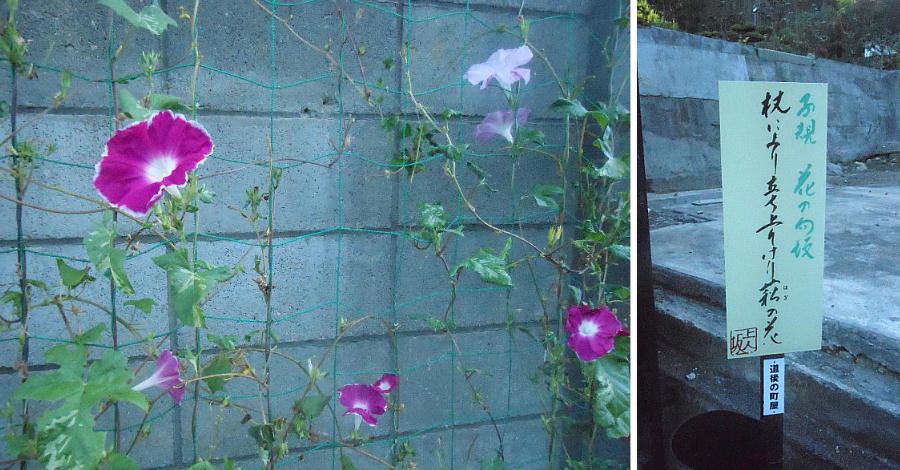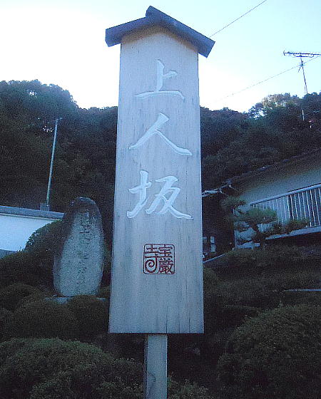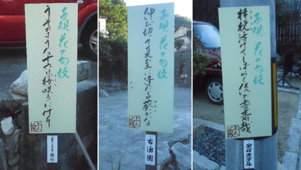 宝厳寺へ続く坂道は上人坂と呼ばれ、至る所に子規の俳句の看板があった。