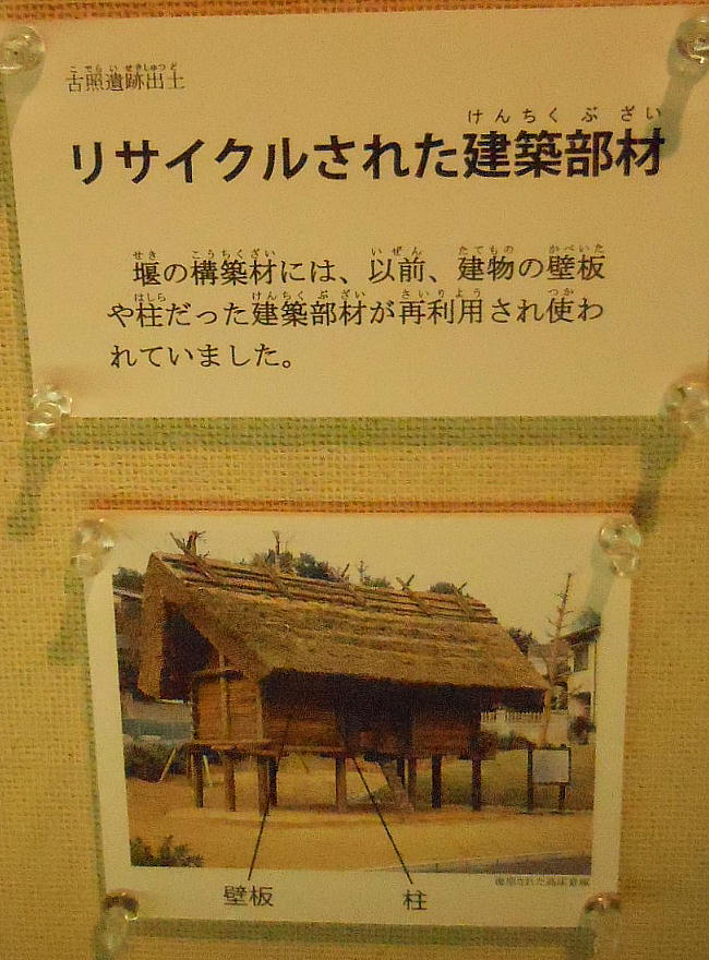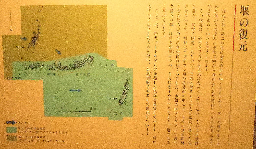 呼ばれるもので、当時の土木技術の高いレベルを窺わせる。堰の上流側には水が流れないように、オギを敷いたり粘土を
