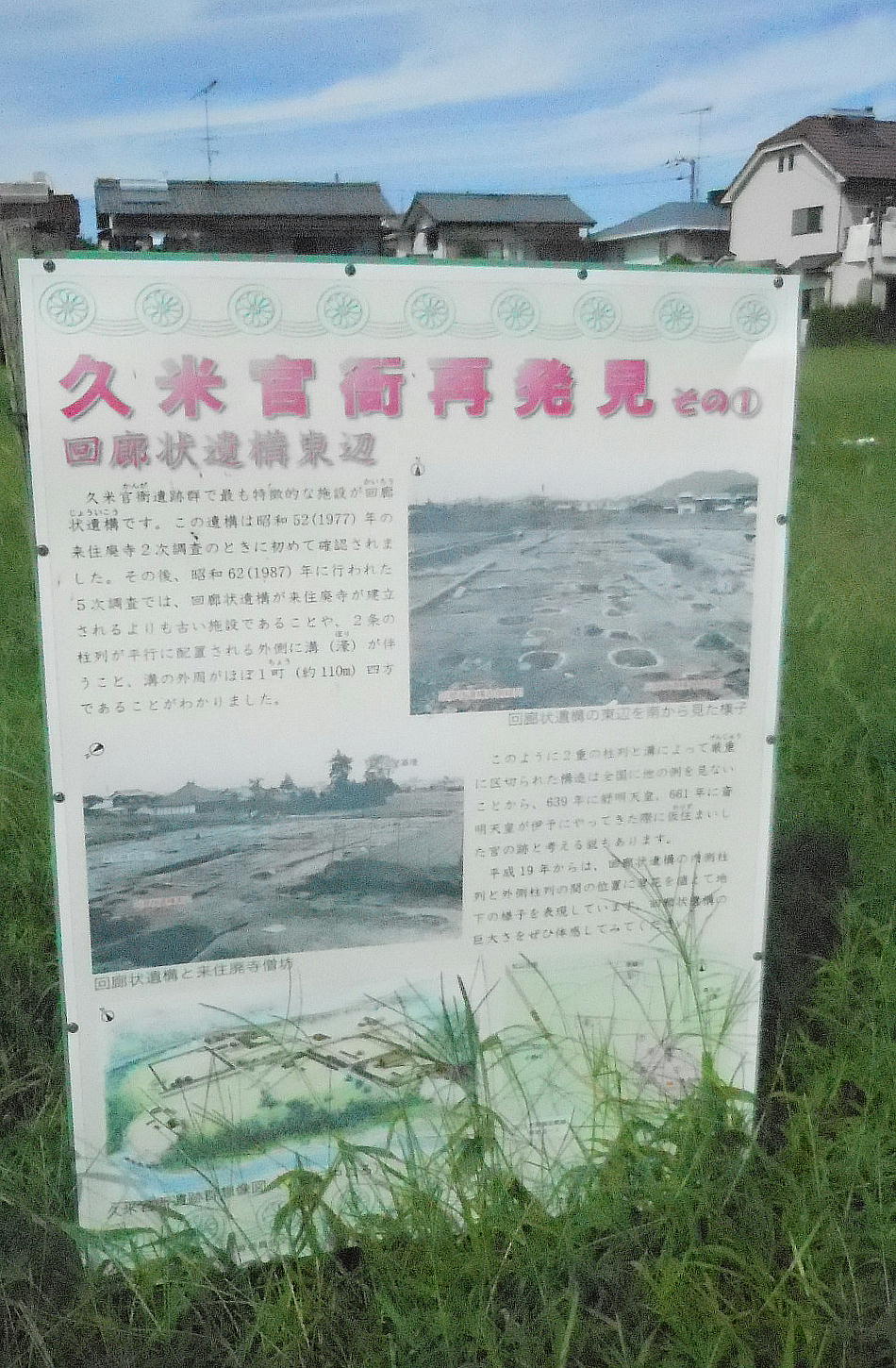 っている。回廊状遺構は、来住廃寺より先立つ施設で、方一町(一辺約109m)規模の大きさで南辺中央に八脚門が取り付