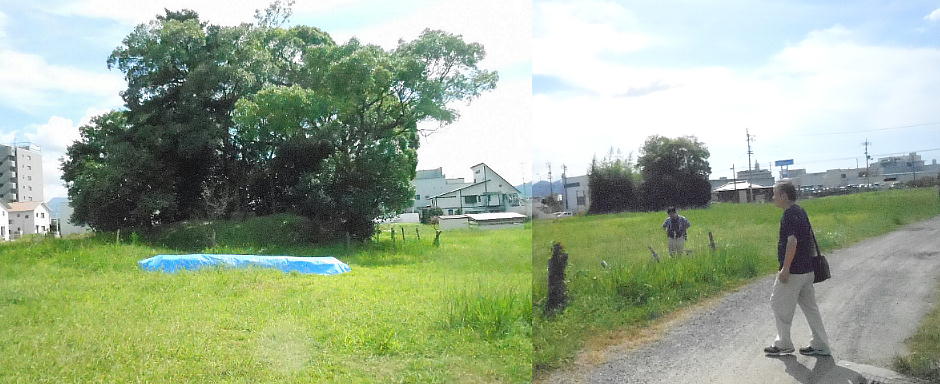 この広場一帯が「久米官衙遺跡群」である。大雑把に、左側が久米官衙遺跡 右側が来住廃寺跡である。