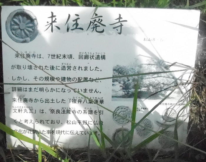 来住廃寺跡は、愛媛県中部の松山平野東部、来住台地に立地し、白鳳期に造営された古代寺院跡として昭和54年に史跡