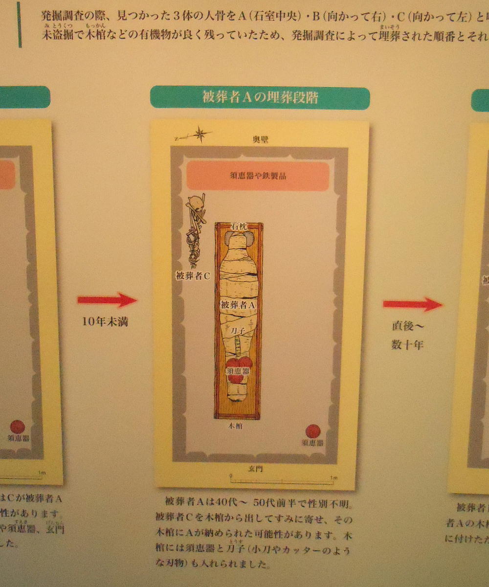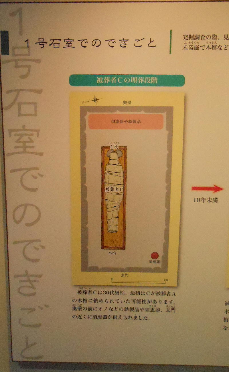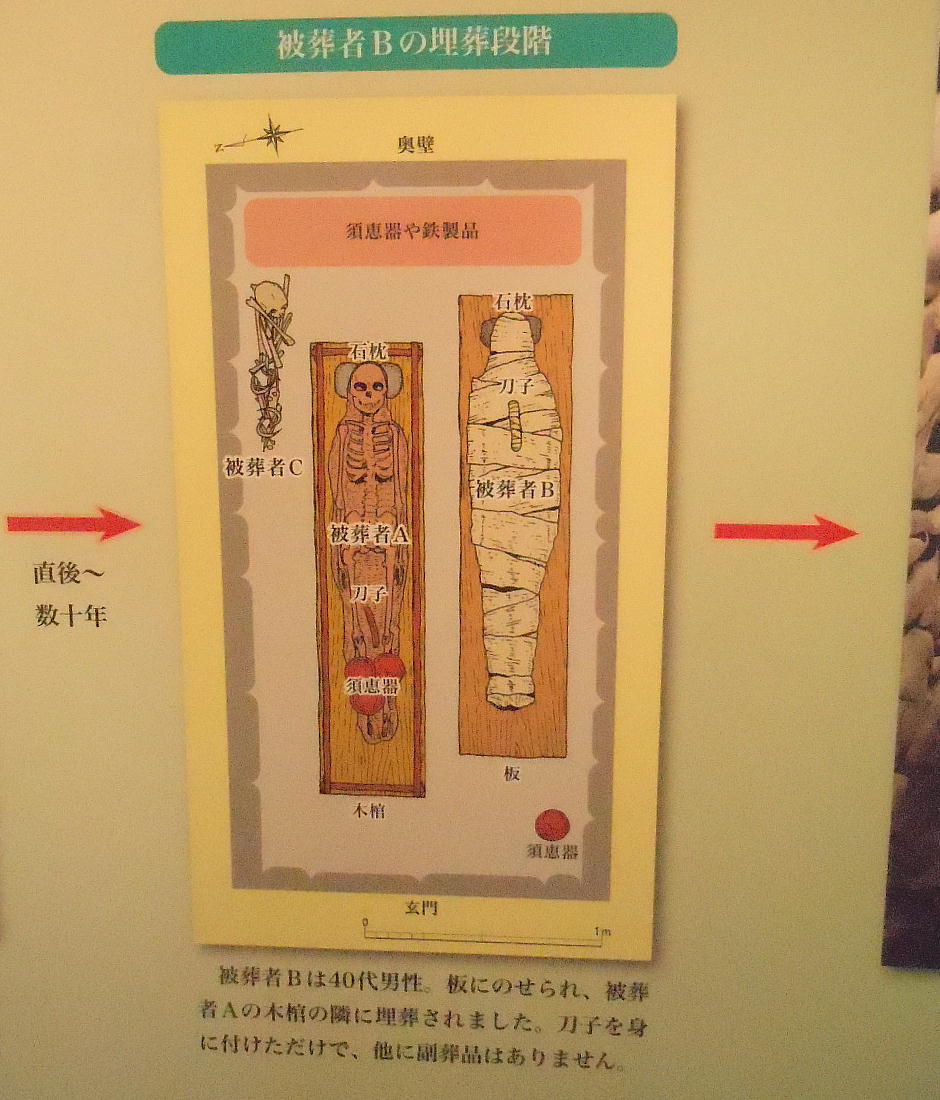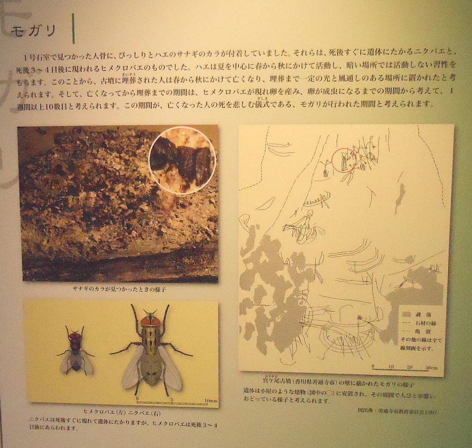 態で残っており、被葬者に付着していたハエのさなぎの抜け殻が日本書紀などに記されている葬送儀礼の検証を可能にした。