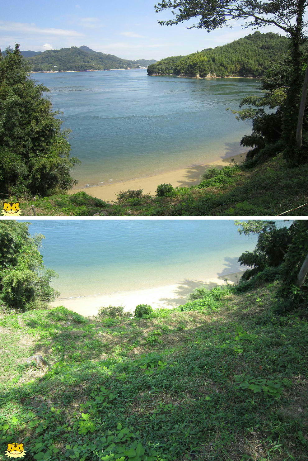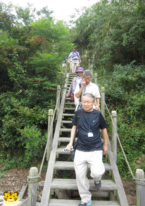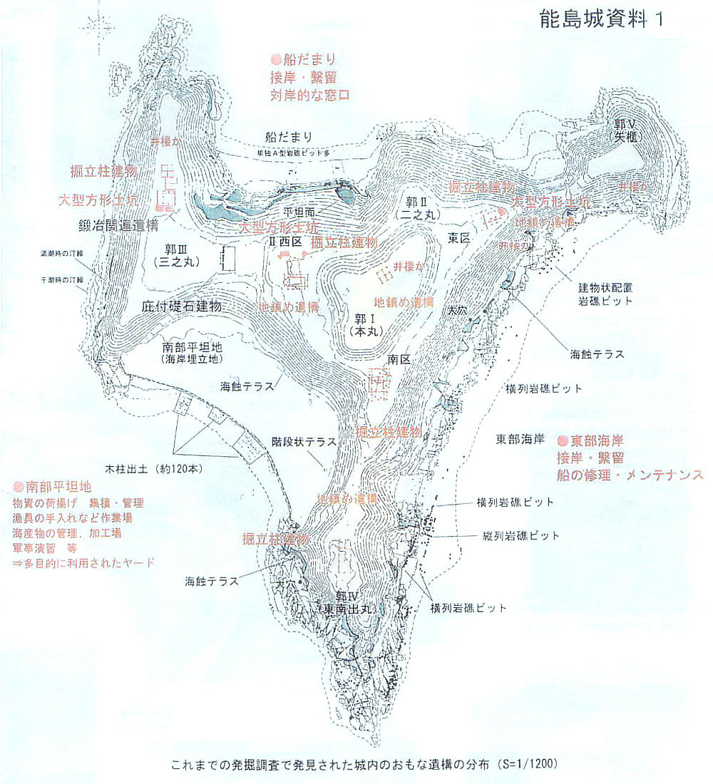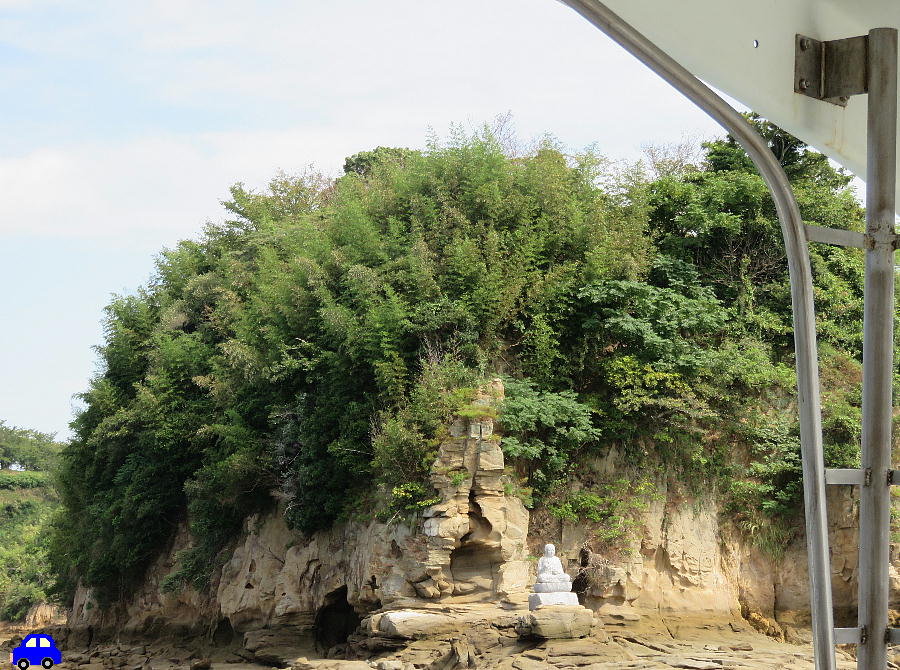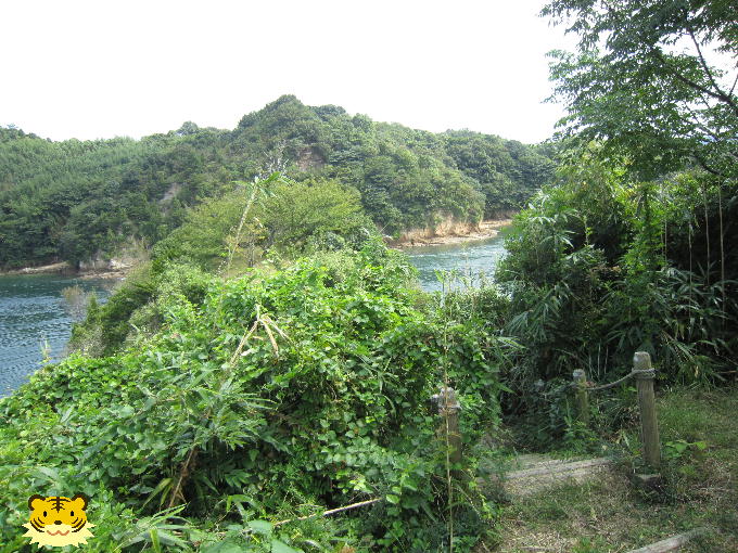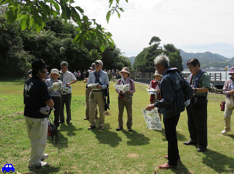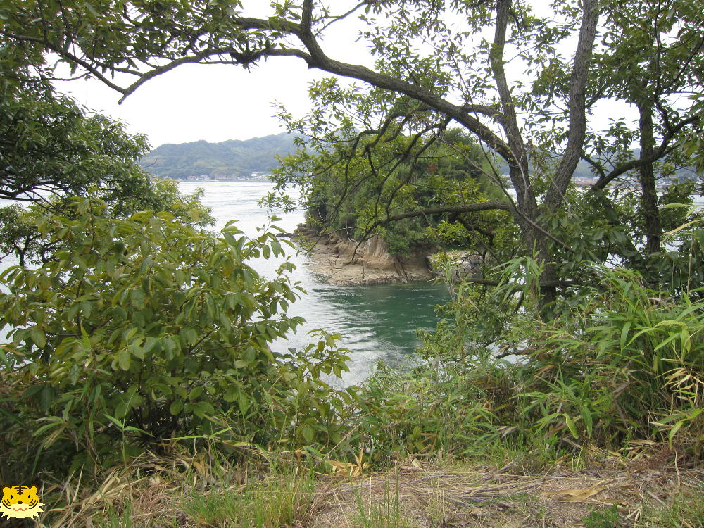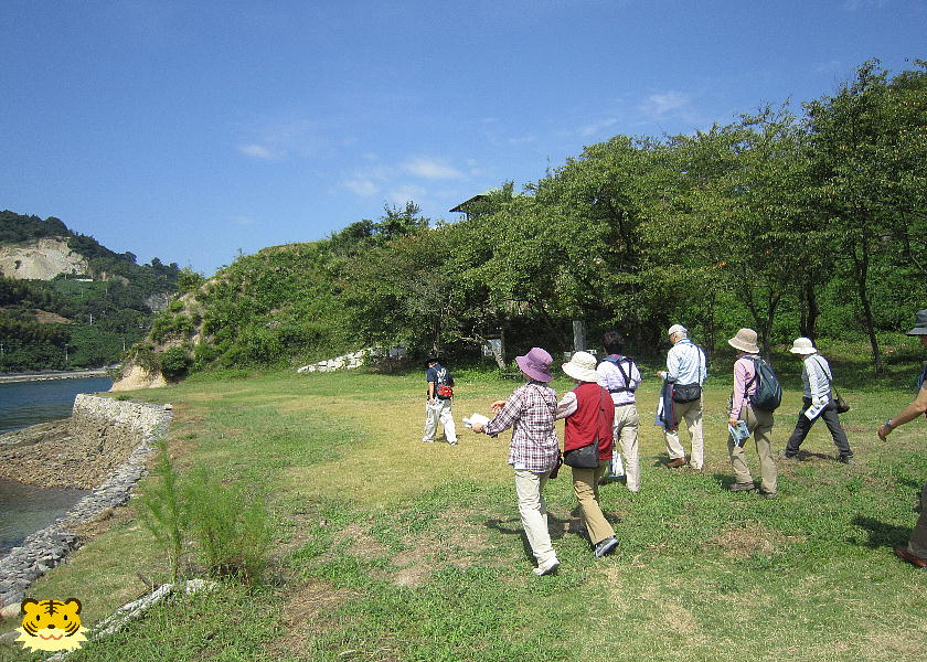 「下に見える海岸は「船だまり」です。あそこの岩に穴が開けてあって、柱の跡が見つかっています。船を繋いだもやいがあったのです」