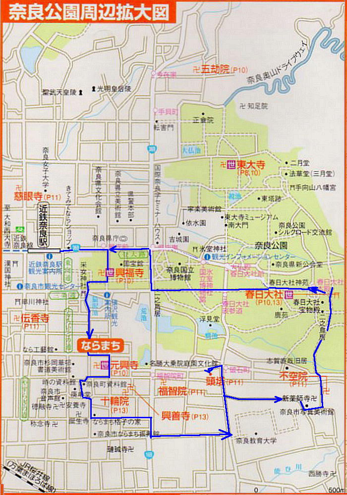 コース: 近鉄奈良駅−興福寺−猿沢池−元興寺−奈良町資料館−崇道天皇社−頭塔−新薬師寺−春日大社・宝物殿−