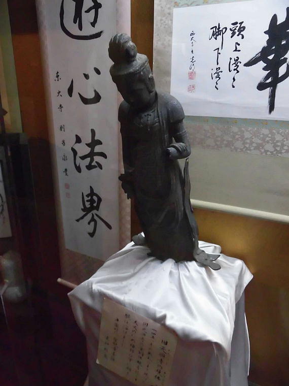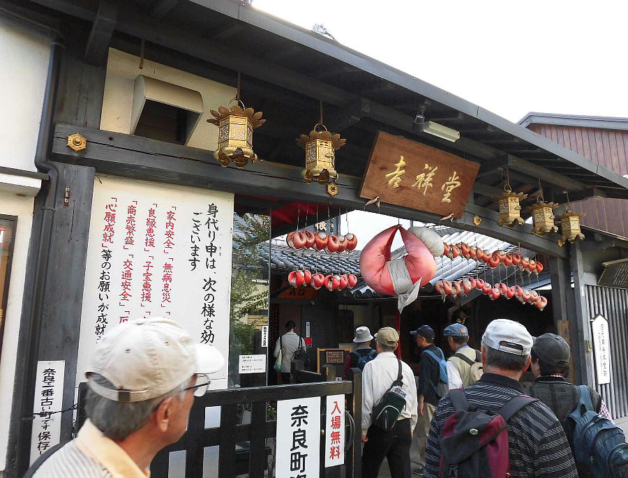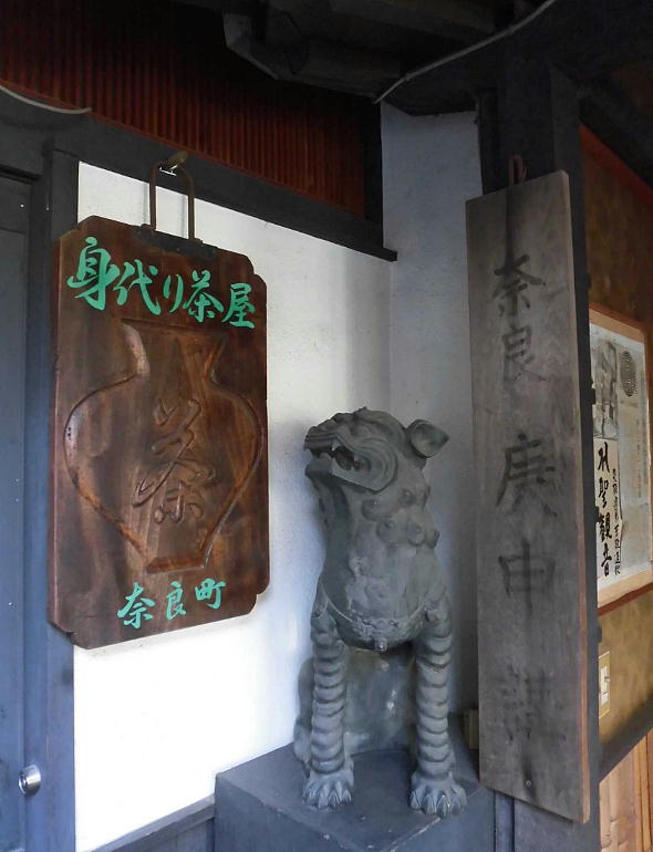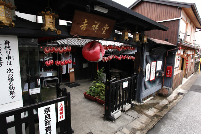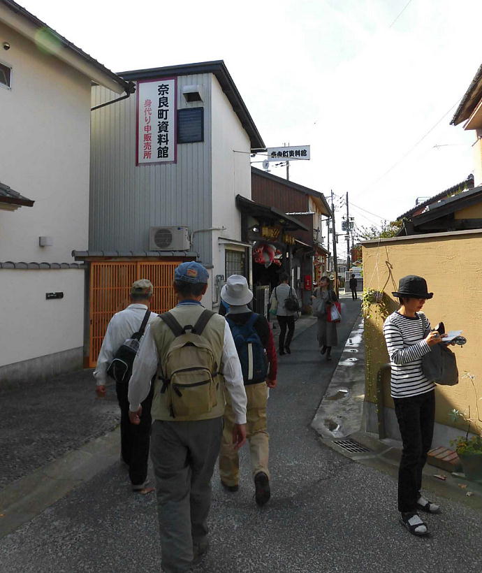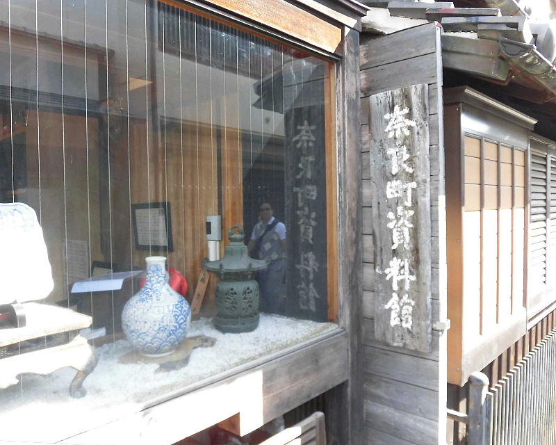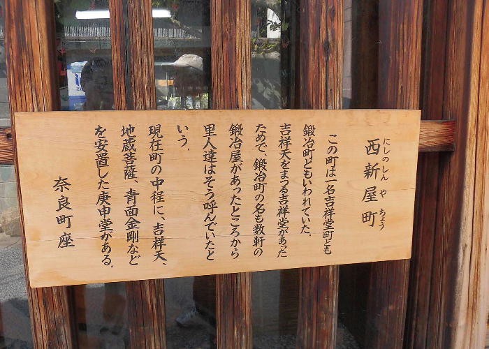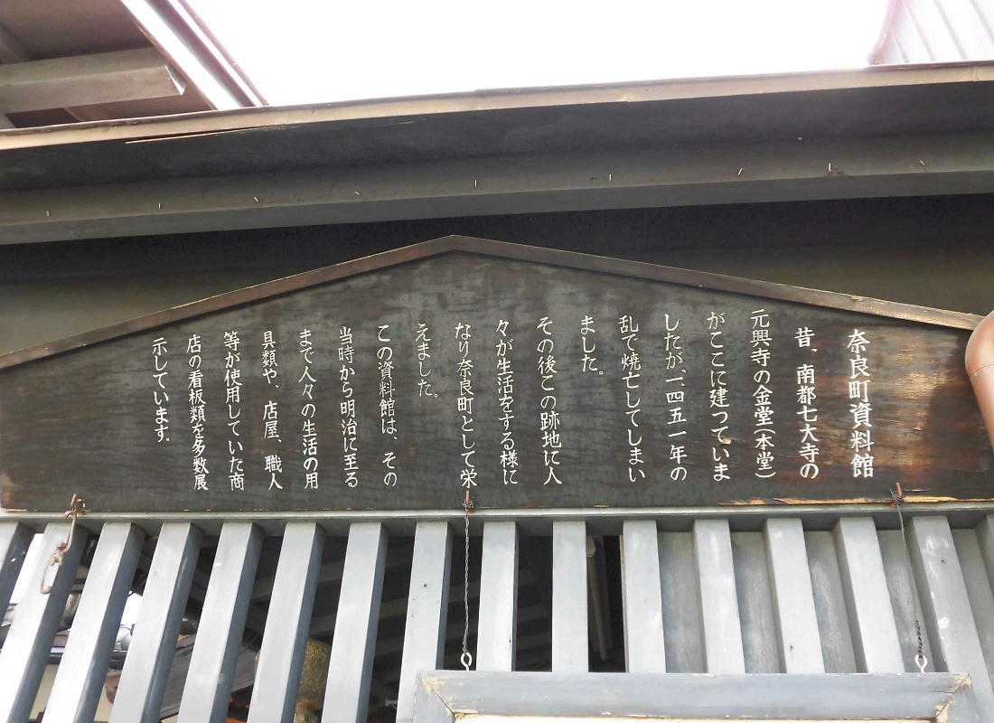 南都七大寺のひとつ、元興寺の門前町として栄え、かつての奈良町の佇まいを今に残す西新屋町に「奈良町資料館」がある。 昭和60年に私設資料館として誕生した「奈良町資料館」には、貴重な資料として、懐かしい昔の看板、美術品や奈良町の艮俗 資料や、仏像などがあり、無料公開している。生活のぬくもりが感じられる民具類を見て、懐かしむ年寄り、昔の人の智恵に 目を丸くする子供たち、守り伝えられてきた仏様に静かに手をあわす人。長年の風雪に耐えてきたこれらのものは、時を越え て人々に感動を与え、今なお光輝く奈良町の魅力として語りつづけられている。<見学無料> (奈良町資料館HP)
