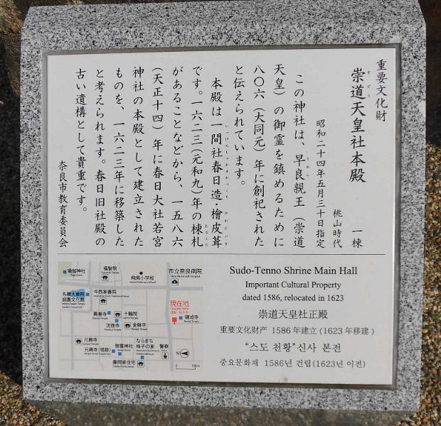 社若宮本殿を移築したもの。崇道天皇は桓武天皇の弟の早良親王のことで、この神社は親王の霊を沈める為に建てられた御霊