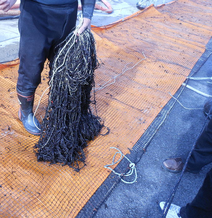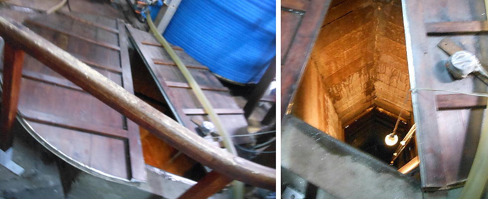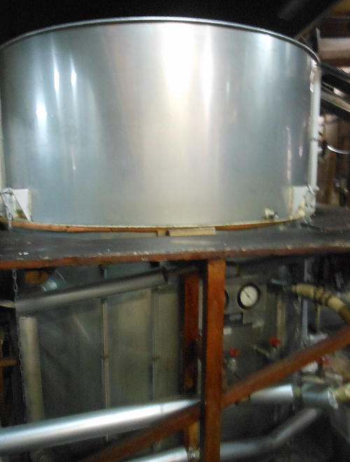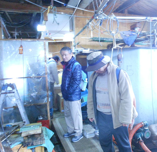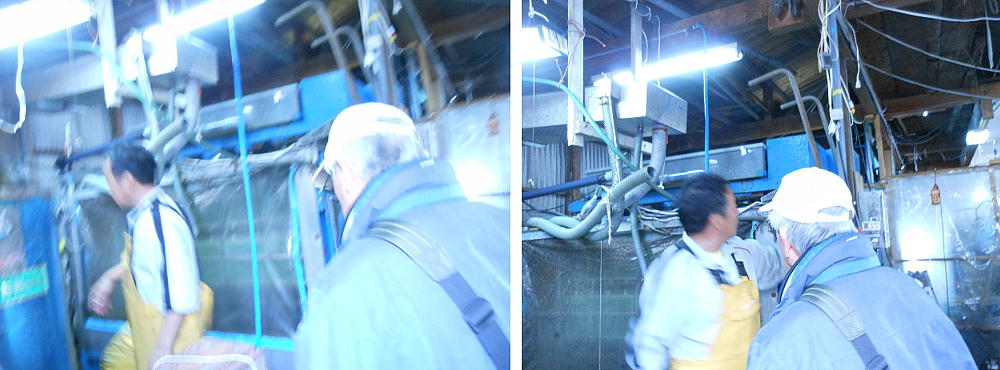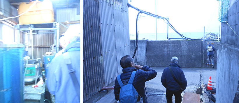 のり工場の見学。採取されたのりは、上の写真、左上のパイプを通って船から工場へ直接移動してくる。