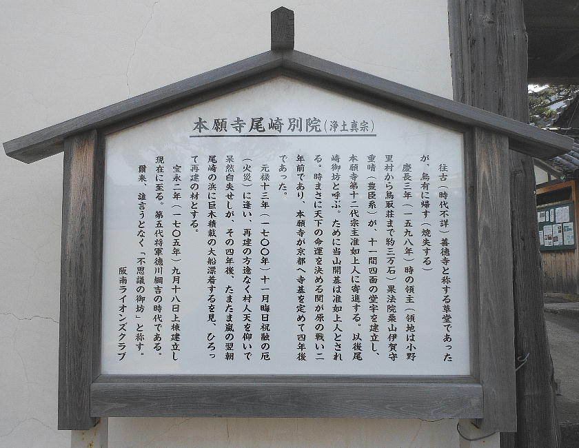 本願尾崎別院 元は善徳寺という草堂(小さな寺)だったが、慶長3(1598)年、領主・桑山正勝の家臣・石田次郎左衛門が改築し、