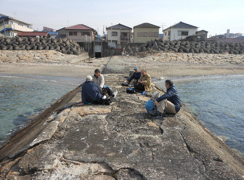 えびの浜近く、海に突き出した突堤(昔の船着き場の跡)があったので、あの上に座り込んで昼食にしようとしたのだが、何と。
