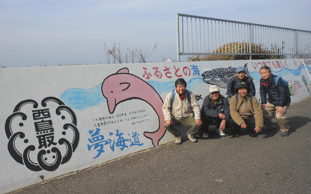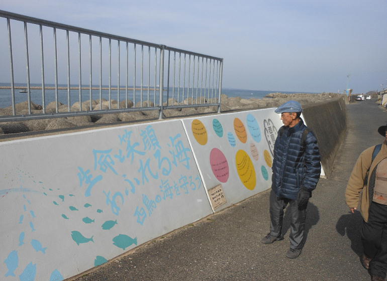 堤防に地元の小学生たちが描いたという壁画が。小学生にしてはうまいもんだ。