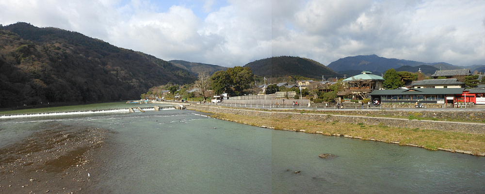 保津川へ降りてくる。「保津川下り」は冬でもやっているが、屋根の付いた屋形船みたいな船だった。カップルしか乗っていない。