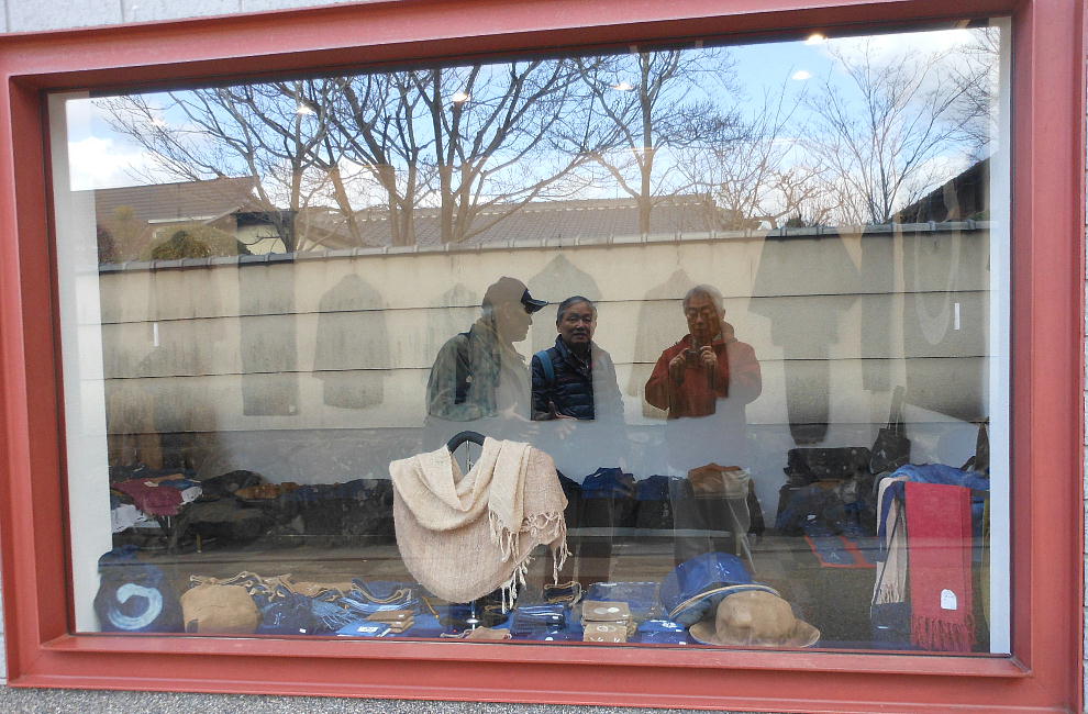 藍染め屋さんのウィンドゥに映った三匹の侍。窓がちょうど額縁のようになっている。