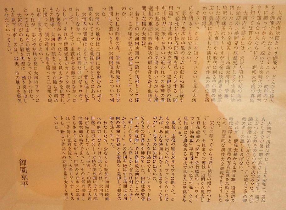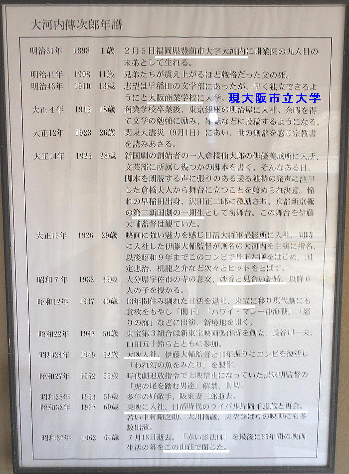 何と、大河内伝次郎は福岡県生まれだった。「豊前市大河内の生まれかぁ」「黒木瞳みたいなもんやな」