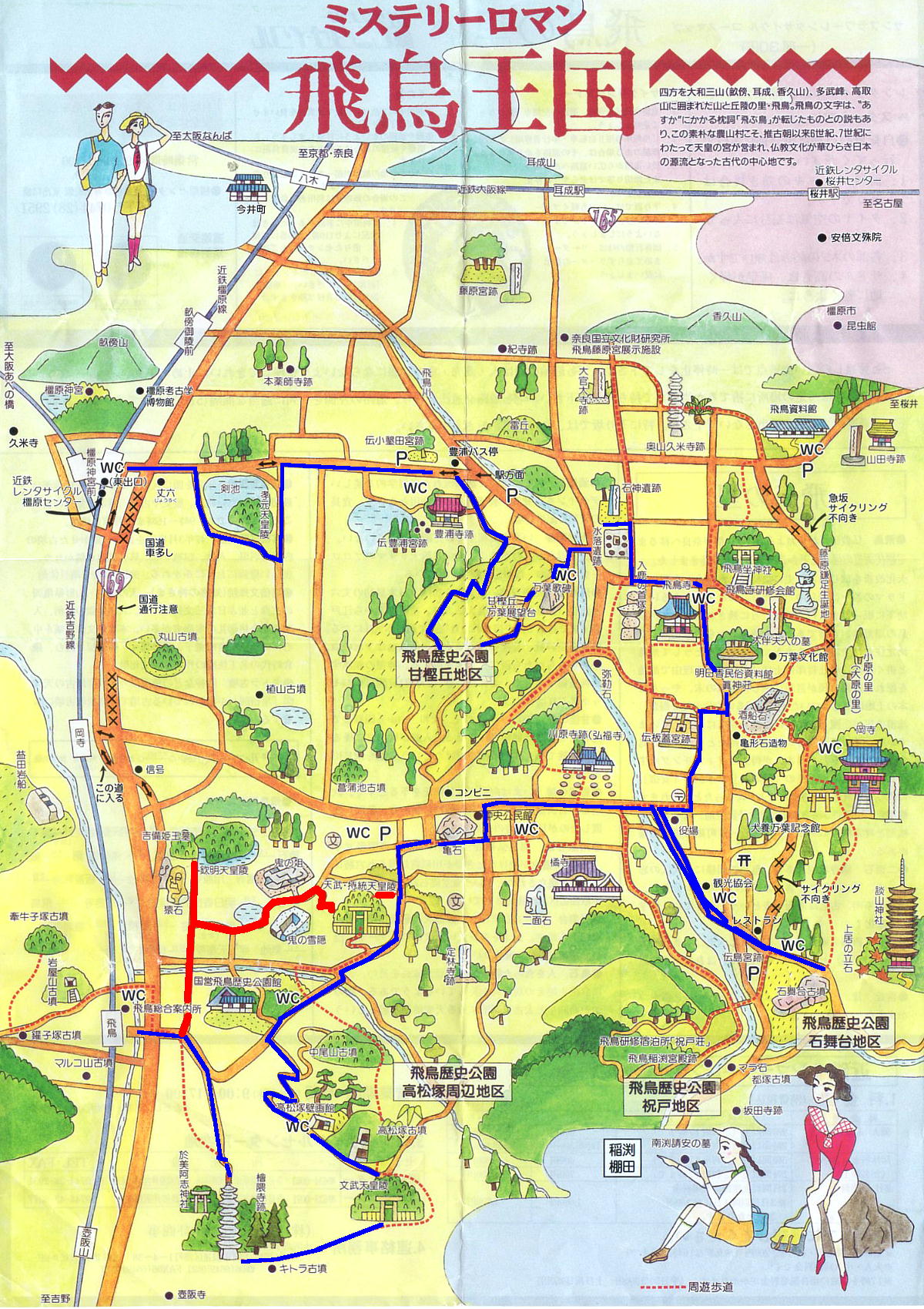 コース: 以下をめぐります。橿原神宮前にてレンタ・サイクルを借り、飛鳥駅で返却。