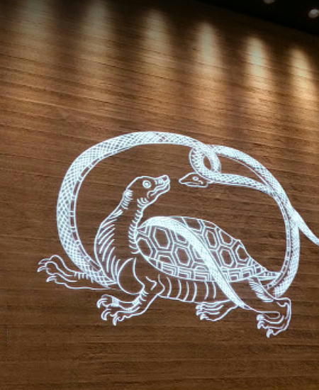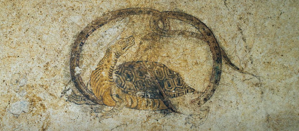 玄武像とは亀に蛇が絡まった像のこと。蛇の体には斑点模様が描かれ、亀の甲羅の縁には円模様が描かれてい