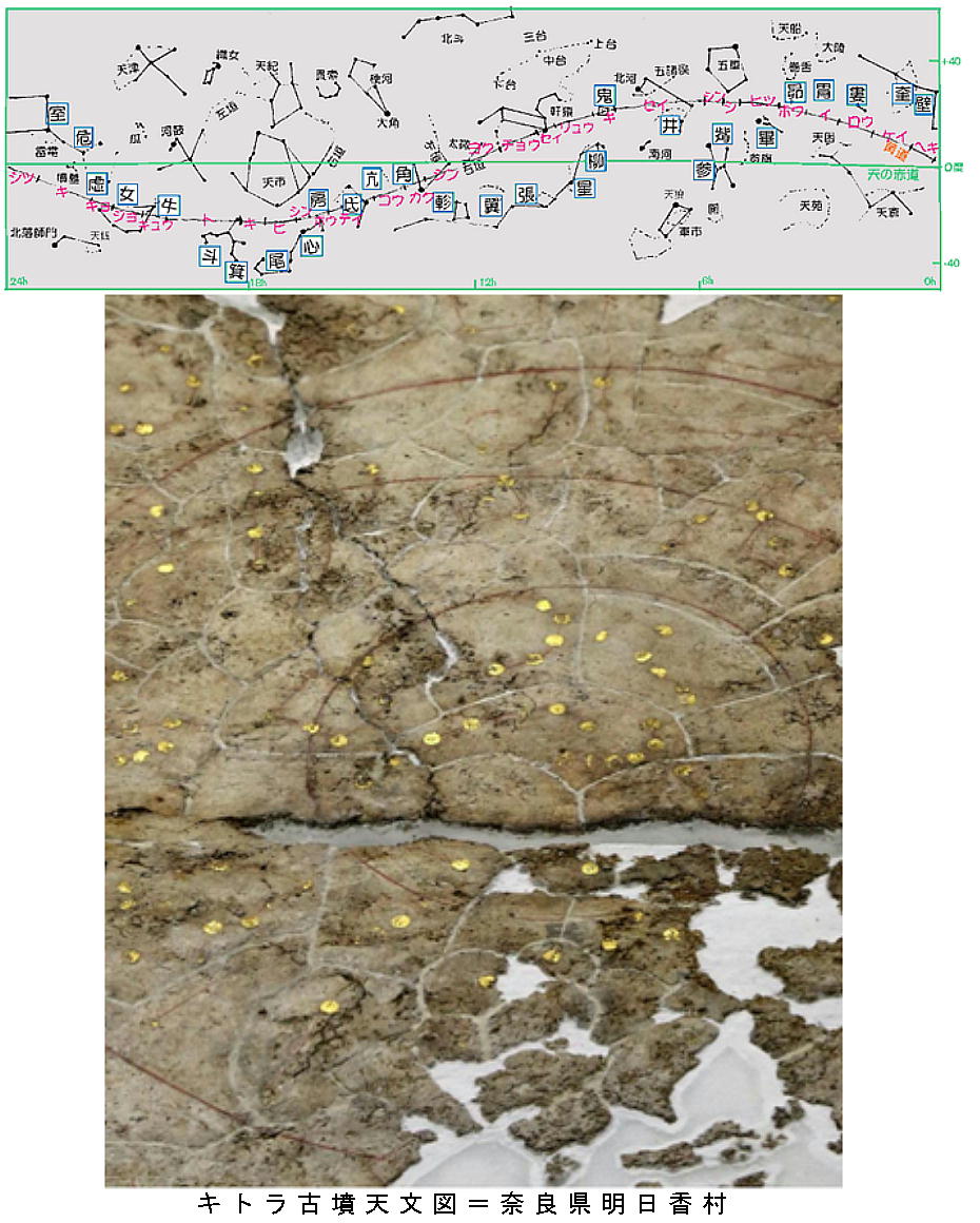 天文図が発見されたのは、高松塚古墳に継いで2例目である。天文図には中国流の星座のほか、赤道、