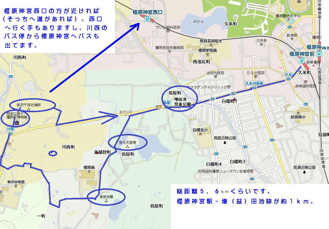コース: 橿原神宮前 − 益田池跡(児童公園) − 宣化天皇陵 − 倭彦命の墓 − 橿原市博物館