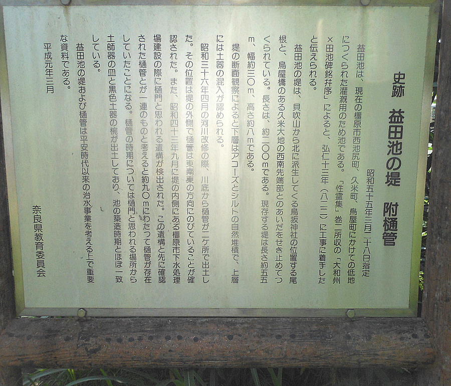 益田池とは、安時代初期に築かれた大貯水池。奈良県橿原市に存在したため池で、現在は消滅している。橿原