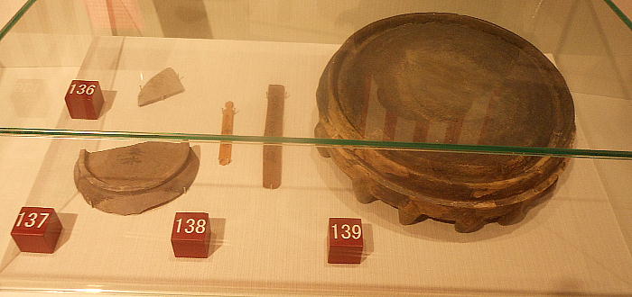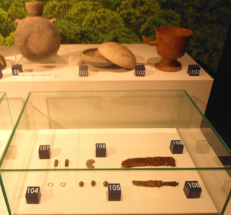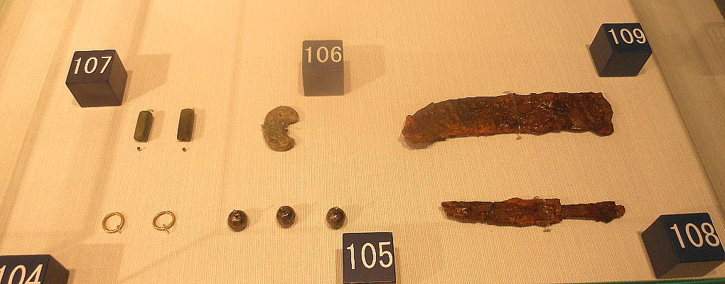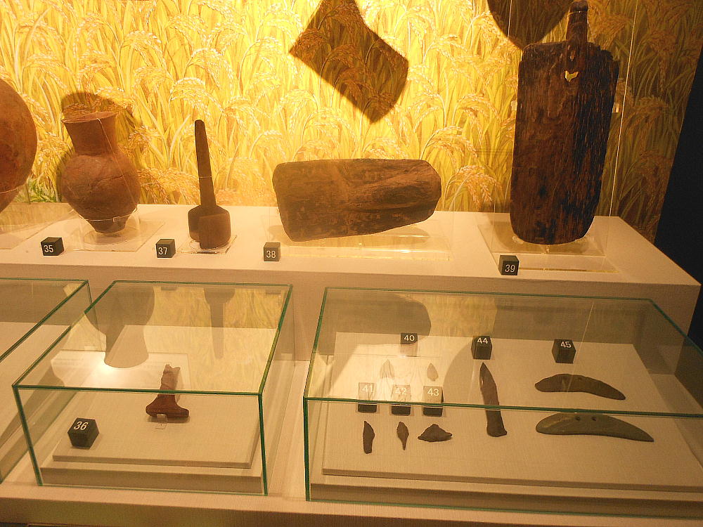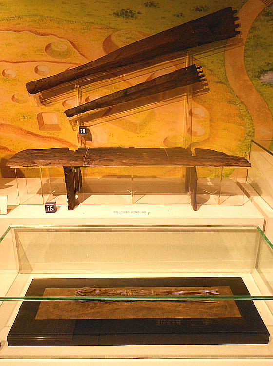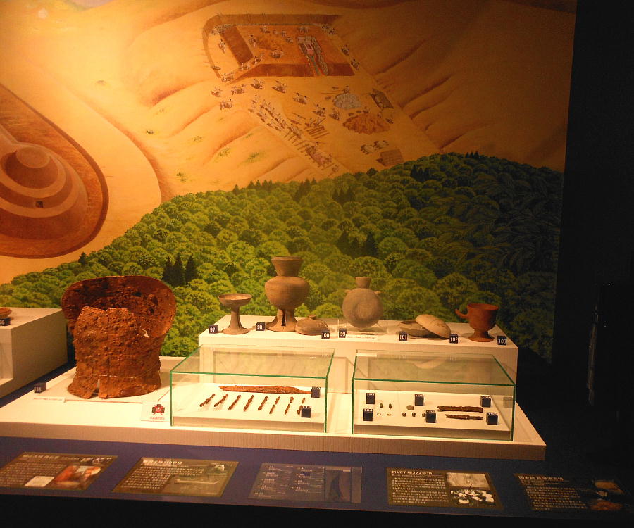 石器、木製品、獣骨などの大量の遺物が出土しており、銅剣を模して作られた木製の柄頭なども出土した。