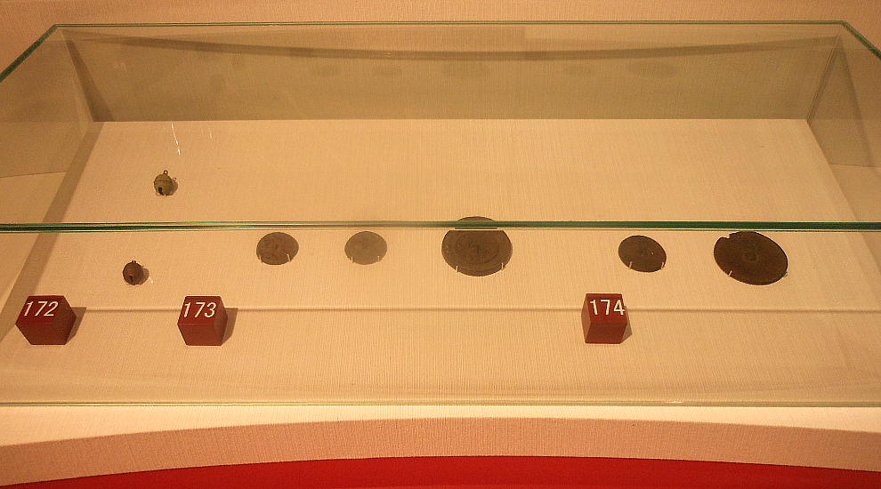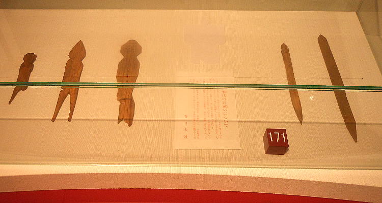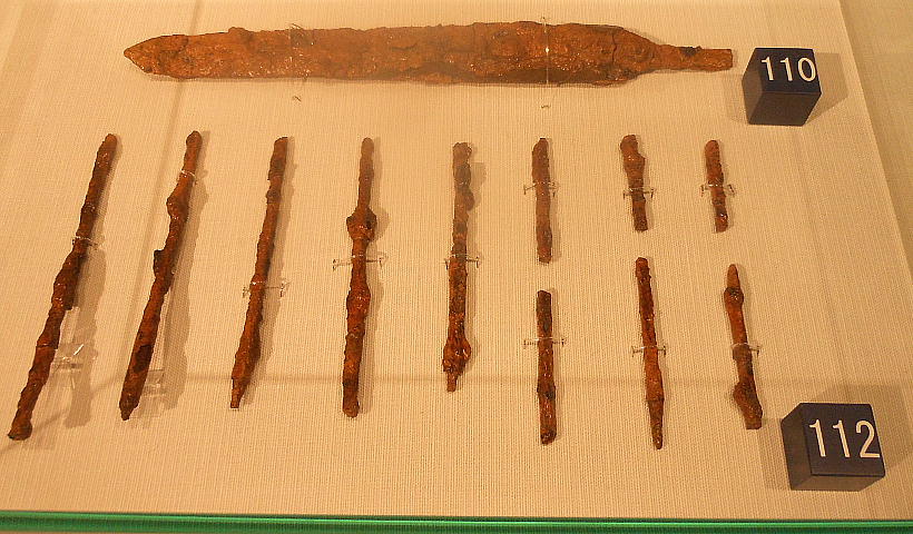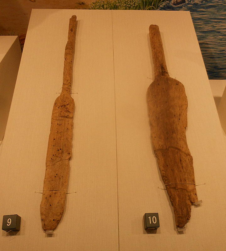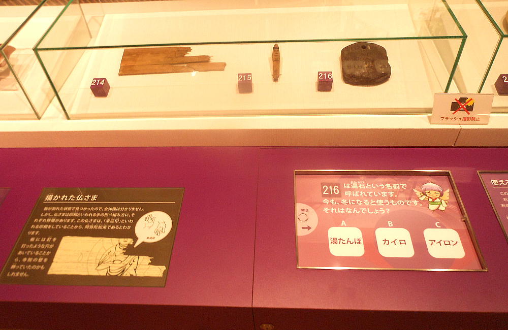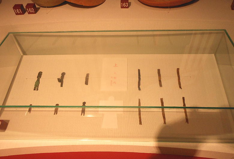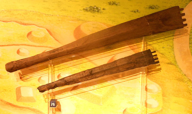 石器、木製品、獣骨などの大量の遺物が出土しており、銅剣を模して作られた木製の柄頭なども出土した。