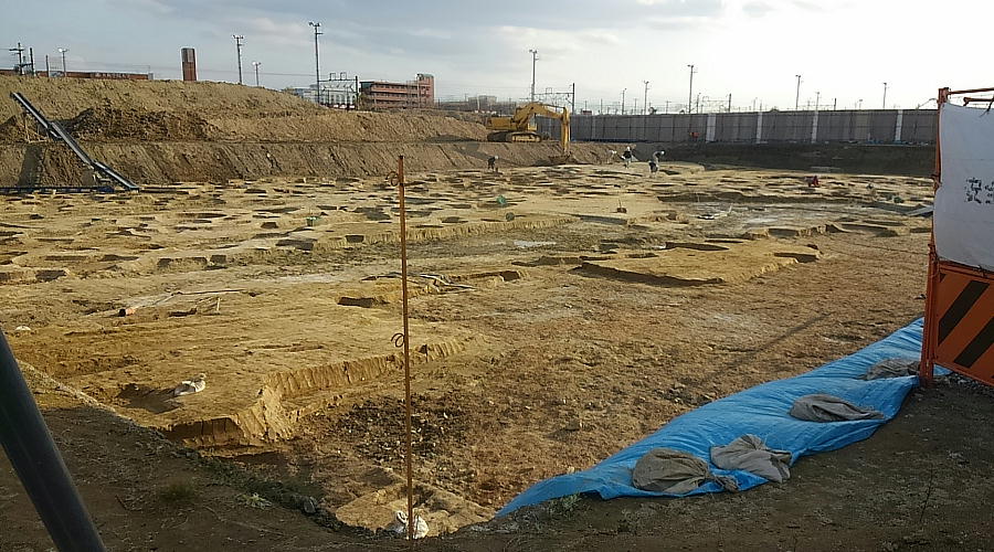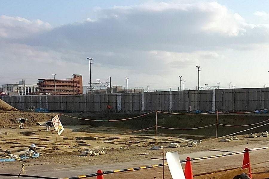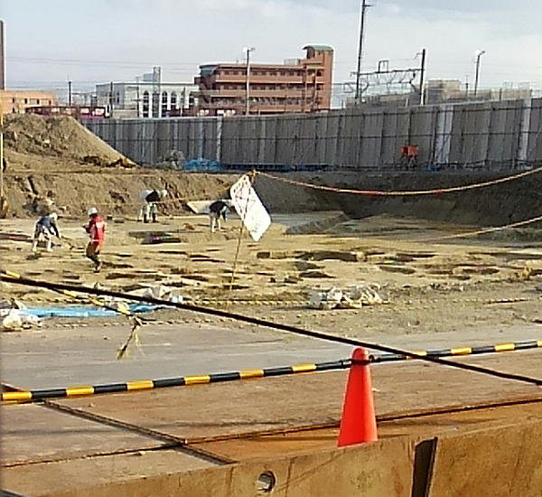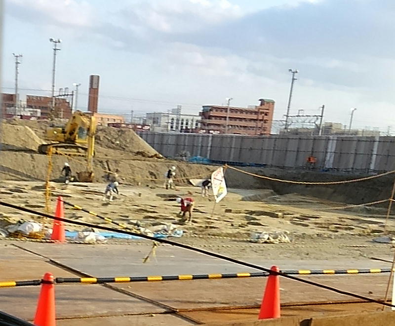 JR岸辺からさらに家へ歩き出すと、吹田操車場跡の工事現場に発掘している所があった。