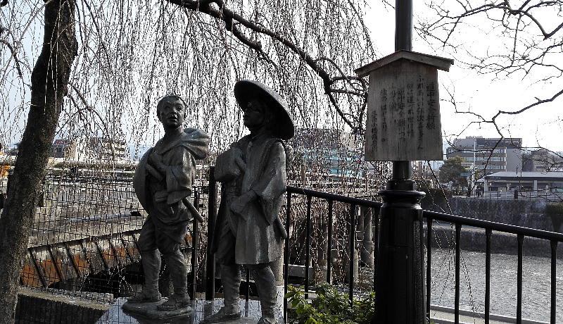 三条大橋のたもとにある「東海道中膝栗毛」の弥次さん、喜多さん。