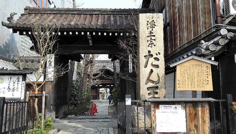にぎわう三条通りに面して「浄土宗だん王」と刻まれた石柱の立つ山門がある。ここが檀