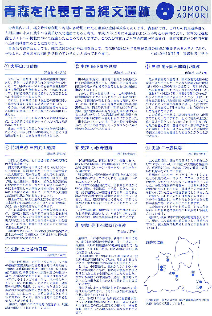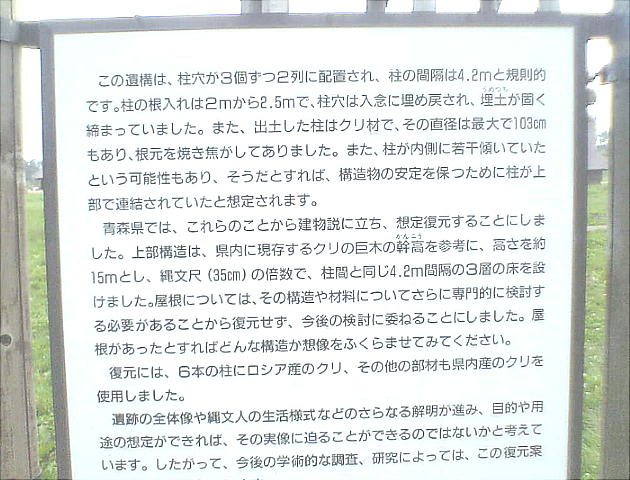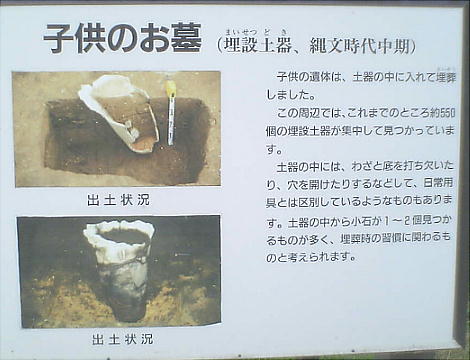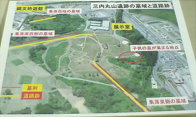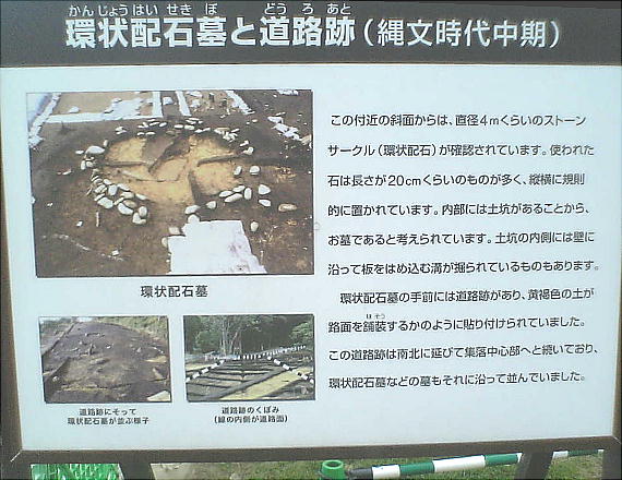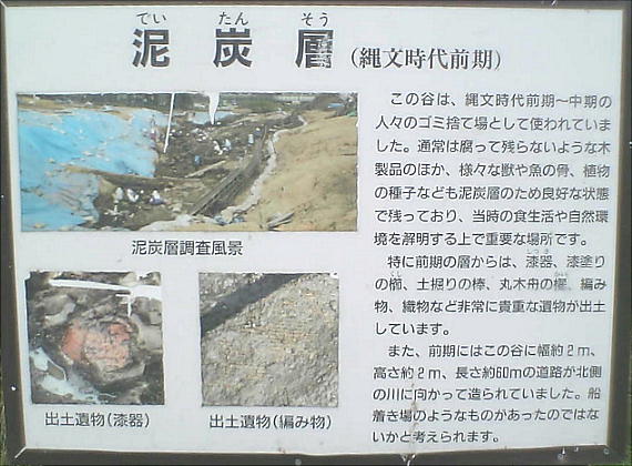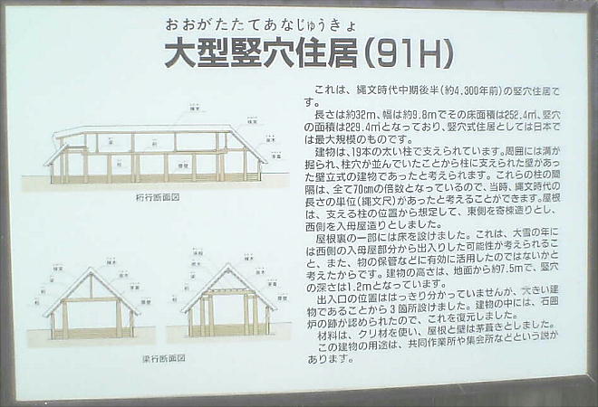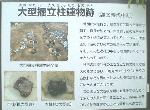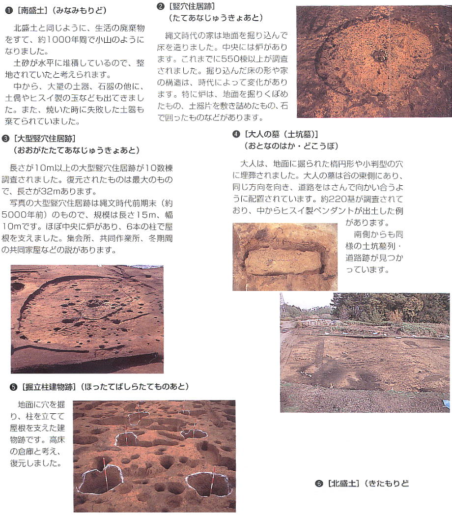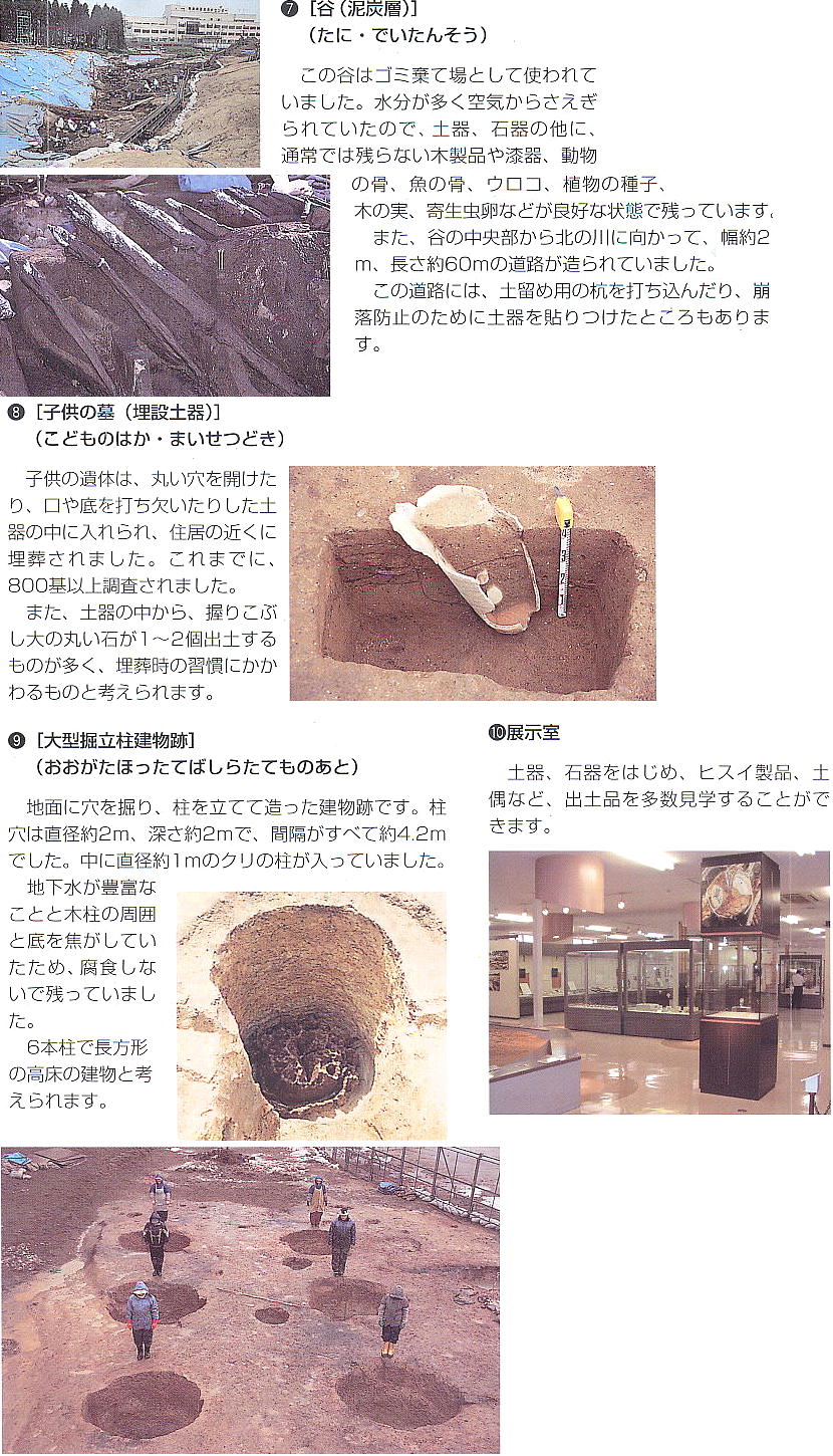 この遺跡は今から約5500年前位から人々が生活を始め、約1500年の間続いた一大縄文集落の跡である。出土する遺物からは、食料とす