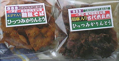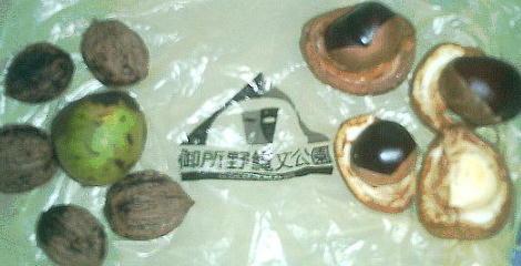 この遺跡で拾ったクルミとトチの実(上右)と、古代のおかし(上左)。