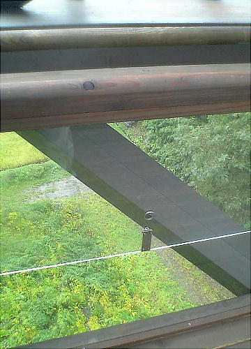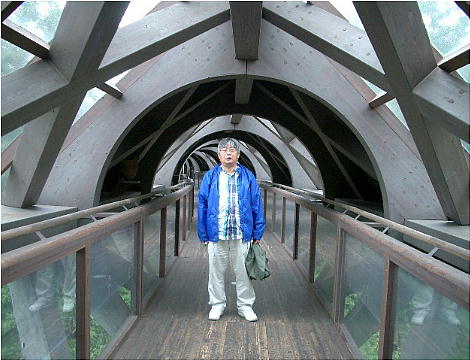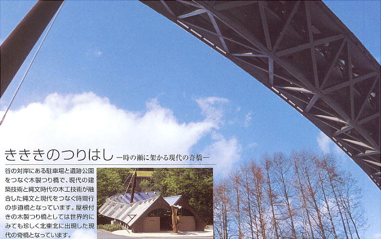 ずらしい橋である。全長約120mがたった1本の鉄柱で支えられている。床も壁も木材で、ところどころに土器や土偶のレプリカ