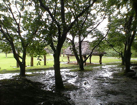 駐車場に車を入れて、雨が強く振り出したので大慌てでエントランスへ走る。遺跡、博物館への入り口は、なんと木で造った吊橋で