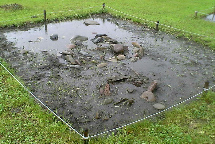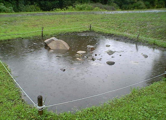 配石遺構は枠で囲ってあるが、あいにくの雨で水が溜まっており、その詳細な形状は見れなかった。