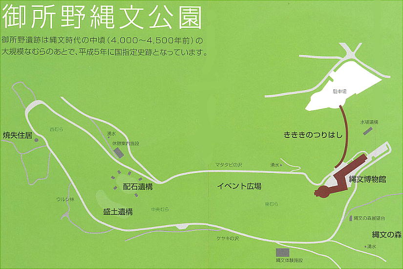 北東北の主要な縄文集落跡で、4−500年続いたと考えられている。集落の真ん中には広場があり、そこに墓や大きな石を規則的