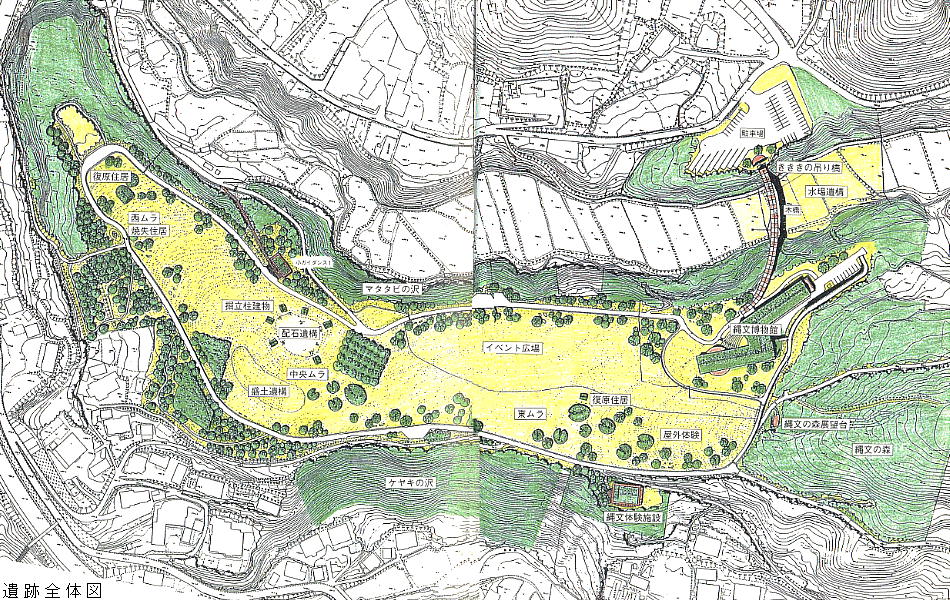 遺跡は中央部の配石遺構(ストーンサークル)を中心として、東西に集落が広がっており、その全域が保存されている。配石遺構群