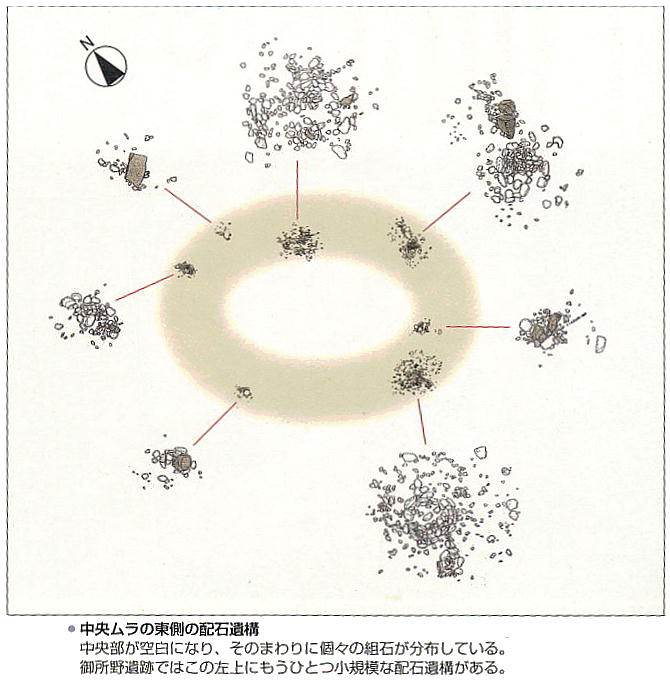 部、東西の三つの村があった。中央部は、中心の広場と配石遺構、墓坑の外側に大きな掘立柱の建物が巡り、C字型に住居跡が囲ん