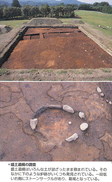 内丸山遺跡や千歳市の美々貝塚北遺跡と同じような、土が山と積まれた「盛土)」もみつかっている。ガイドさんの話では、配石遺