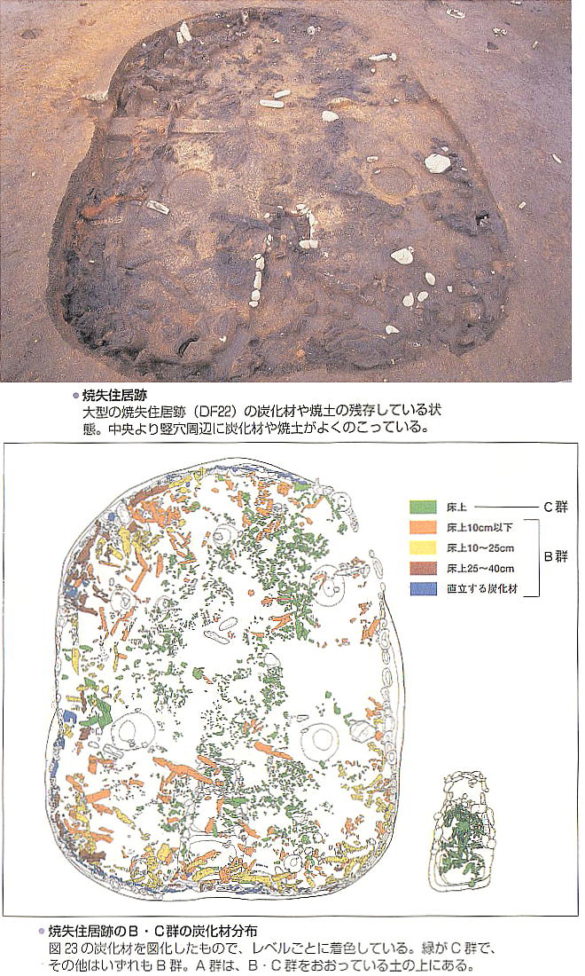 平成8年の発掘調査で、縄文時代中期末(約4千年前)の焼失住居跡が5棟発見され論議を呼んだ。というのは、住居跡内に堆積して